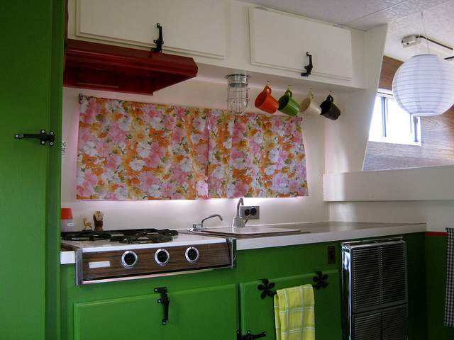 7680426402_54d5b0f7a4_zThe options are endless when it comes to using wall space as a place to store kitchen items. Place hooks on the insides of your cabinet doors to hang utensils and other items. Depending on your RV’s interior design, you can hang nets like these under your cabinets to store fruit and other items, saving space in the refrigerator and/or countertops.