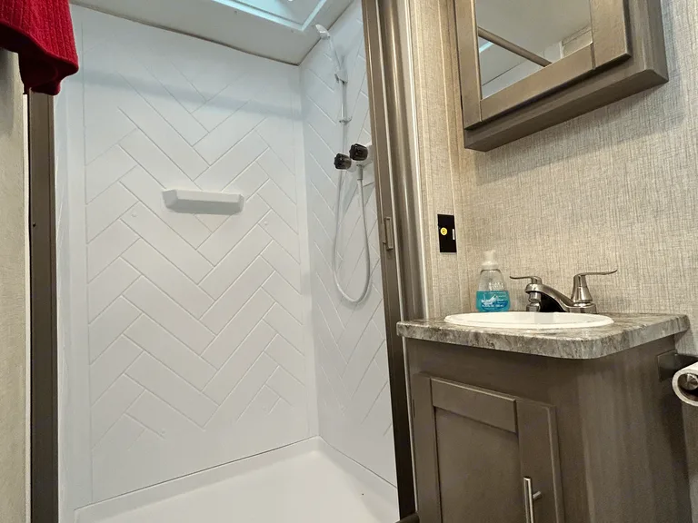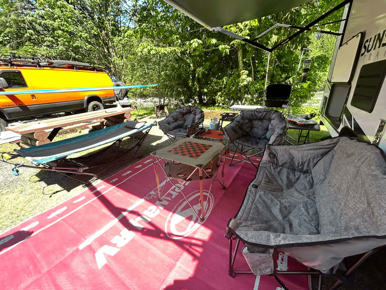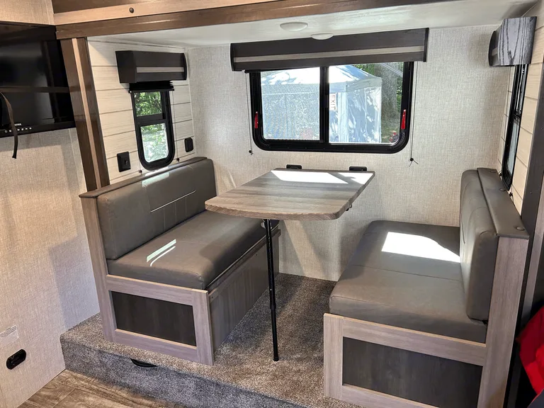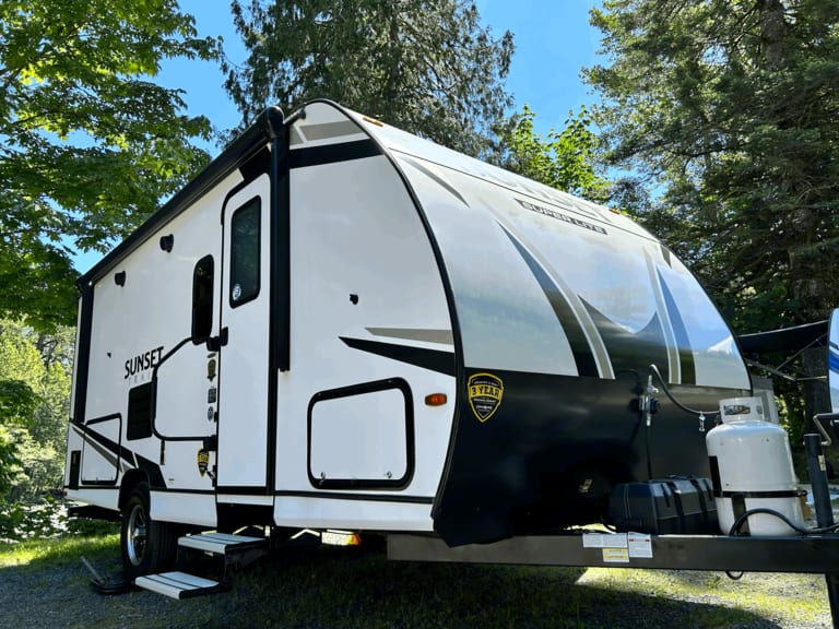 Here's what you can expect when you rent our 18' Travel trailer:Spacious and comfortable: Our trailer features two double bunk beds, a dinette that turns into a bed, and a queen-sized bed that transforms into a comfy couch, providing plenty of sleeping space for up to 8 people. Plus, with an indoor shower, outdoor shower, and great lighting with windows on all sides of the trailer, you'll have all the comforts of home wherever you go.Solar power and inverter: Our trailer is equipped with solar power and an inverter, so you can enjoy all the modern conveniences of home even when you're off the grid.Plenty of extras: We offer drop-off and pick-up options, as well as 20+ different extras to make your camping experience even better. From camping chairs and propane fire box to a portable grill and outdoor games, kayaks, fishing equipment, outdoor living room and so much more. We've got everything you need to make your trip a success.Air conditioning and heating: Whether you're camping in the heat of summer or the chill of winter, our trailer has you covered. With air conditioning and heating, you'll stay comfortable no matter what the weather. (AC only when connected to external power or generator)Entertainment options: Our trailer features a 32" TV, so you can enjoy your favorite shows and movies even when you're in the great outdoors.Rent our travel trailer on RVezy today and experience the ultimate in glamping comfort and convenience!What's includedCookware, plates, bowls, utensils, Other things to note-Pets welcome!