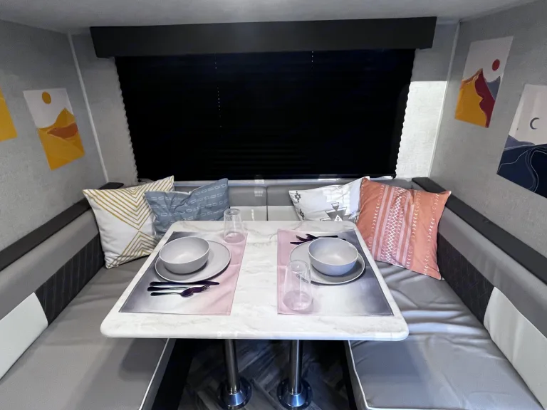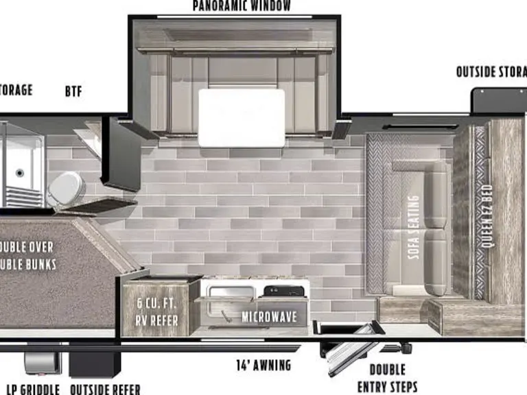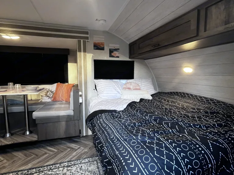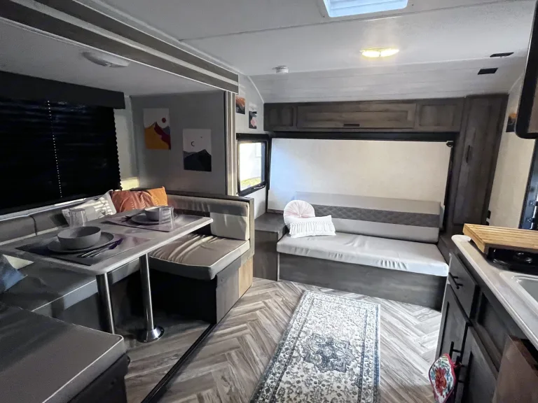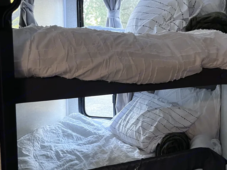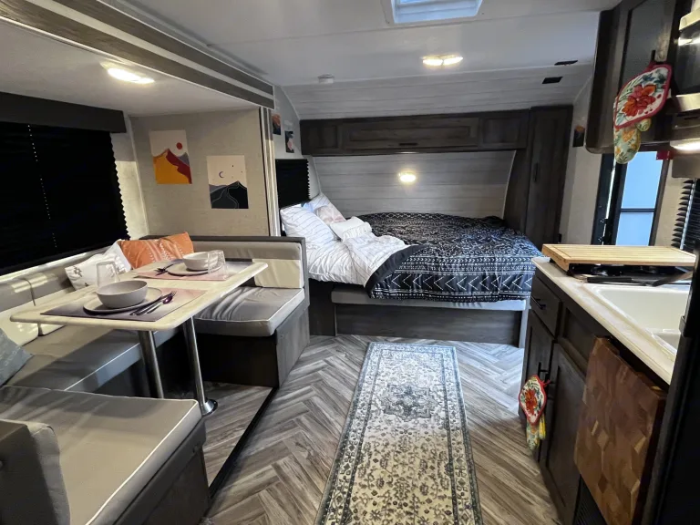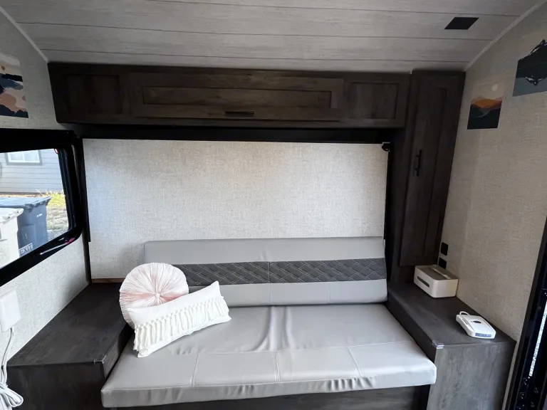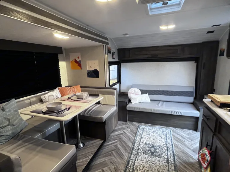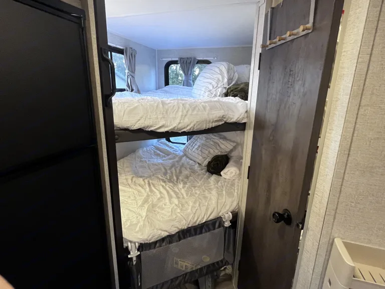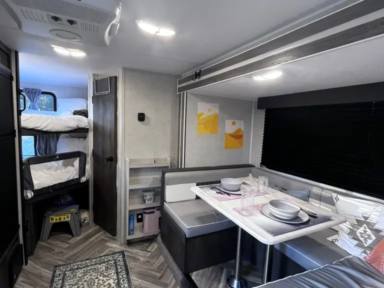 Double wide bunks, bottom bunk has a baby gate that folds down out of the way.U- shaped dinette on the slide out makes it feel quite roomy inside. We’ve had 6 adults comfortably hanging out during a rainstorm. Queen bed folds up during the day and reveals a couch.Outdoor kitchen has a cast iron griddle, roll away butcher block, LED lighting, and mini fridge. Awning is almost the full length of the trailer giving lots of shade.Fridge is propane/shore power, water heater is propane only. Includes a small plug-in heater which keeps the place toasty when needed (and doesn't use propane). Also has AC for warmer days.