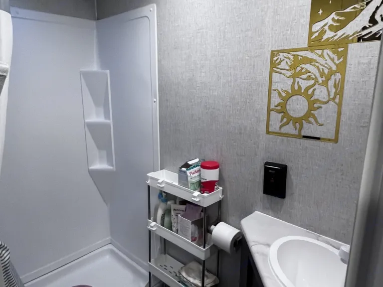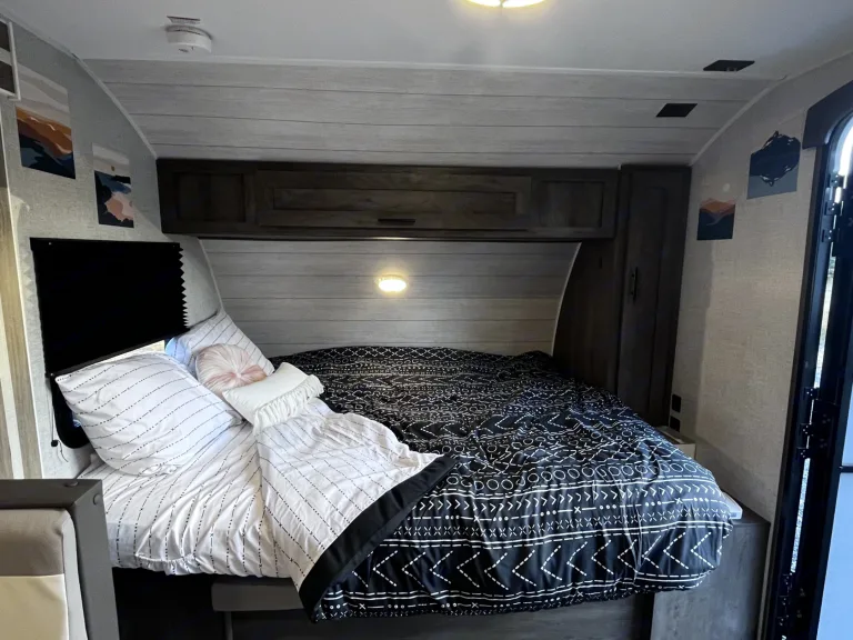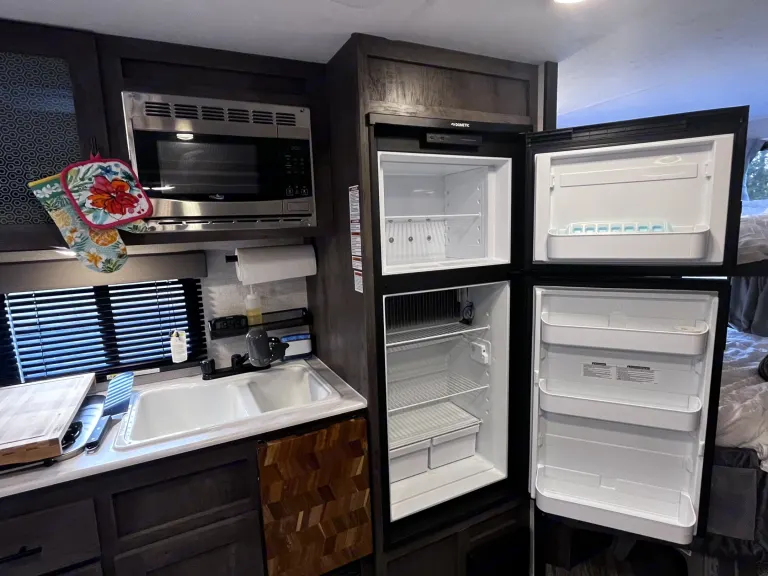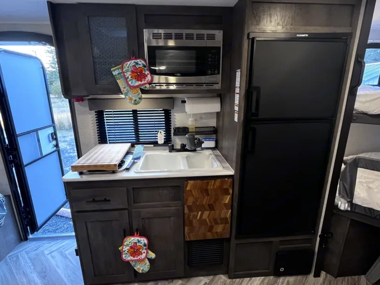 Kitchen includes two burner gas range, microwave, and fridge with small freezer.USB and electrical outlets throughout for charging devices. What's includedFor sleeping: Fresh bed sheets, pillowcases and pillows. Mattresses and pillows have protective covers on them.For showering/Bathing: towels, body wash, shampoo, conditioner, hand soap, RV toilet paperKitchen/Cooking: cookware, dishes, cooking utensils, Keurig and k-cups, dish soap, dish towelsOther: outdoor rug, double camp chair, fold away table, blue tooth speaker, iPhone charging cord