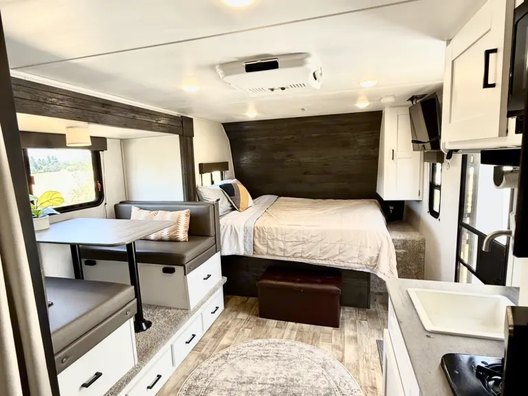 This Keystone Hideout camper will make your next getaway one to remember! It is the perfect combination of cozy and spacious, with all of the amenities you need for your trip. Upon entering, there is a queen bed to the right and a kitchen to your left. There is a pop-out slider to provide plenty of extra room, with a dinette that can be converted into a bed. The dining table is a great spot to eat a meal or play games. There is also a twin over twin bunkhouse, complete with a blackout curtain for privacy and a ladder to get to the top bunk. In the bathroom there is a stand up shower, a vanity with a sink, and a toilet. The power geared awning provides a shady area to enjoy time outside of the camper while you drink your morning coffee or sit by the campfire. Our goal is that this trailer allows you to have a comfortable, simple, and fun trip! This is a great trailer for those that may be looking to test out the camper life prior to purchasing their own. Easily towable by SUVs and trucks of all sizes. What's includedThis camper comes with everything you need! Towels, linens, a fully stocked kitchen, a french press, hot water kettle, shampoo/soap, one roll of paper towels, one roll of toilet paper, and a trash bag to get you started. We also include a propane fire pit, one full propane tank, and a 22inch Blackstone griddle for outdoor cooking. The camper has solar panels that can help provide power if you are boondocking. There is a mounted Roku TV inside available for you to use. RecommendationsThere are a ton of amazing places to camp in the area! Spend the day wine tasting at nearby vineyards, or enjoy a trip to the beautiful Oregon coast about 1 hour away. Other things to noteNo smoking inside the trailer, please and thank you! We request that you take shoes off upon entering in order to maintain cleanliness. Please be mindful of weather conditions when using the awning as in-climate weather (i.e. high wind gusts) can easily cause damage. The awning is not to be left out unattended or overnight. We welcome your pets to join you, but please be responsible owners and clean up after them.Contact host for a first-responder discount if applicable. We appreciate you! :)