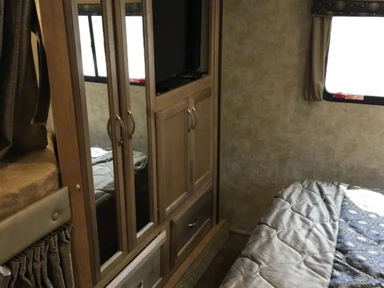The Peggy Marie is an all around crowd pleaser, at only 32 feet and sleeping 10+ its hard to beat this RV when it comes to price per bed, driveabitly and maneuverability. It has all the bells and whistles and comes with everything you will need to make your trip as comfortable as possible. Inside and out this RV is brand new and clean as a whistle. Everything IS NEW. It has the very desirable Bunk beds in the rear slide out making it perfect for kids or larger groups. There is another slide out in front. The over the driver bunk sleeps two if need be and the leather couch and dinette set fold into very comfortable beds and both have seat belts as well. There is a very comfortable queen size bed in back with a DVD player and tv in the rear and front of the RV. Full Kitchen. The outside of the RV has plenty of under storage and an outdoor shower, speakers, power plugs, power retractable awning, and rear hitch for towing. The RV comes fully stocked which includes: bedding, pillows, towels, DVD's, games, lawn chairs, dishes, garbage bags and more. There is also a satellite that picks up all local channels, in town you can get 75+ channels, out of town is a lot less but still good. We have also just added automatic leveling jacks that are a very nice addition to an already great RV. NO Music Festival or other Event rentals please. We only rent for established campgrounds with hookups. Thanks What's included• Everything you would need to camp. Recommendations• Bluetooth speaker