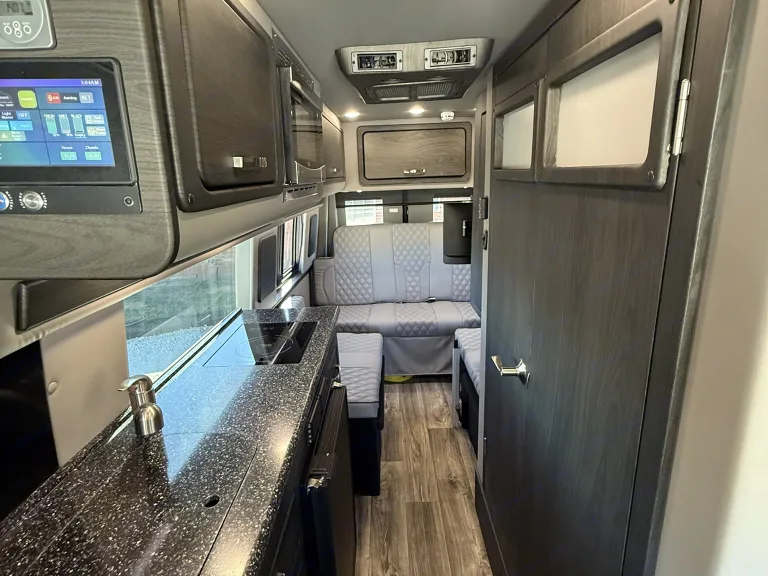 RV rental interior featuring a digital control panel, USB charging port, cup holder with remotes, and comfortable seating.. Midwest Automotive Designs Ultimate CamperVan 2023