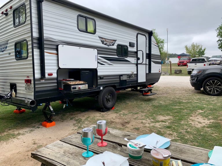 Come glamping with Priscilla!! Priscilla is a 2022 23ft Wildwood FSX - a Very easy to tow lightweight trailer. She’s Perfect for families and couples. She has a queen bed, two full sized bunks, and a dinette that converts to a bed - enough room to sleep 6! Large fridge (larger than most any trailer this size!), gas range, and microwave - so bring all of your food and drinks for the trip! The bathroom has a full shower and a curtain with pockets to hang all of your toiletries for easy access as you’re getting cleaned up from a day of outdoor fun. Did we mention there is an outdoor cookspace and fridge? And an outdoor shower?!? Set up the camp chairs, grab a beer from the outdoor fridge, throw some burgers on the griddle, and just relax….At 4000lbs, Priscilla can be towed by most vehicles - an Explorer is fine, you don’t need an F350 to come glamping with this girl! (note: please check your vehicle in the Outdoorsy app below)Why is this the best RV? It’s fully loaded with everything you need for a trip including everything you need to cook, relax, sleep, and enjoy the outdoors - including camp chairs and a rug, indoor games, outdoor games, and all the linens. DON’T PAY Extra FOR Sheets!! That’s absurd. Just bring your clothes, toiletries, food, and fishing gear, and you’re good to go in Priscilla! We don’t want to nickel and dime you for an extra towel, we want you and your family to have a fantastic vacation. What's includedEntertainment