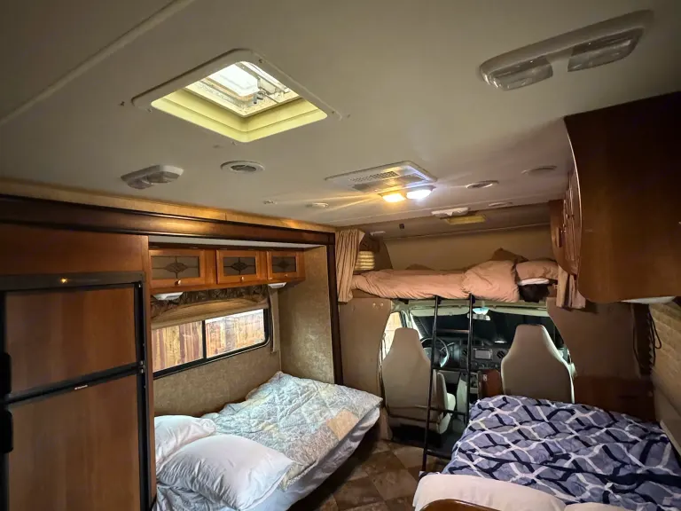 Explore this rv rental's interior, featuring three distinct sleeping areas, a refrigerator, and a skylight overhead.. Forest River Coachmen Leprechaun 2015