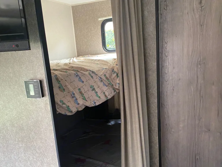 Take the whole family, pet included in this bunkhouse style travel trailer. Enjoy your family while watching a movie from your private room or a warm meal from the dinette. Refrigerator works when plugged into power or with propane gas.