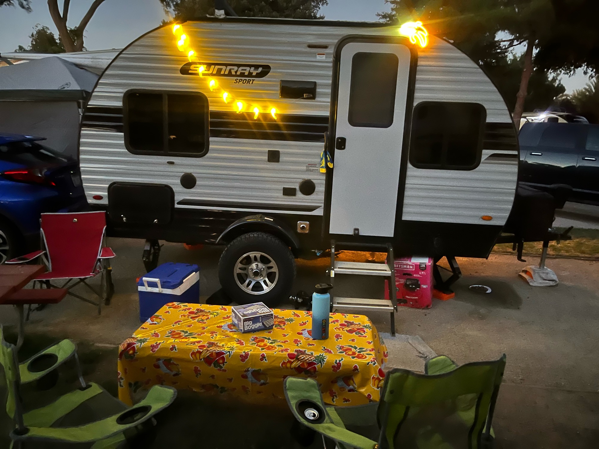 Meet Minnie Pearl!Our brand new Sunray travel trailer is perfect for a spontaneous camping trip, long weekend or a fun road trip. We bought our very first travel trailer last year and since then have taken several memorable family vacations both in and out of state. We were total beginners at driving and towing a trailer but we're happy to say that it was easier than expected and our new trailer tows with ease!The trailer sleeps 3-4 people (three adults or two adults and two small children). There is a large full-size bed and one dinette table that breaks down into a twin-size bed. The nice workable kitchen space includes a refrigerator, 2-burner stove top & microwave. The kitchen is stocked with utensils and some cookware. The trailer has a bathroom with shower so no need to visit the public restrooms at the campsite. The trailer also has a super warm heater and an awesome air conditioner!We're happy to answer any questions you might have. Reach out anytime!Happy Trails for now!GretchenWhat's includedTrailer rental includes 4 camping chairs, a portable tabletop BBQ (small propane can required), cookware, dishware, utensils, basic hand tools and tools needed to operate the trailer. Let us know if you're going to the beach and we'll load you up with two boogie boards! RecommendationsThe Central Coast, No-Cal and So Cal…California offers so many easy camping and RV park destinations! We've gone on numerous long weekend trips: Napa Valley, Yosemite, Russian River, Santa Cruz, Monterey, SLO, Solvang, along the Central Coast, Joshua Tree, San Diego, as well as out-of-state trips to Nevada, Arizona, New Mexico and Texas! Plan your trip and hit the road with this easy to tow 16’ trailer!Other things to notePlease note that due to COVID-19 we are not providing bedding or towels. Guests must provide their own sheets, pillows, pillowcases, blankets. This is the best way for everyone to have peace of mind during this challenging time.Delivery to and/or from your home or to a local campsite is available upon request for an additional fee ($150 within 15 mile radius). If you are looking for a total glamping experience we also offer complete trailer delivery, set-up, breakdown and tow home services ($400-$500 within a 50 mile radius). Additional distances can be negotiated.If you need to extend your stay unexpectedly, we're happy to be flexible and try to accommodate additional nights if we don't have other reservations for those dates. We also offer a 10% discount for weekly rentals (7 nights).
