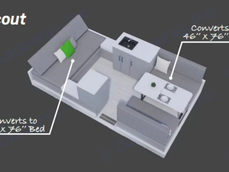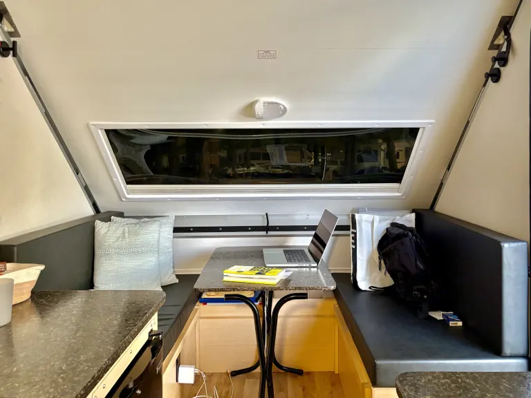 There comes a time when you just can't sleep on the ground no mo'. Enter our Scout, a pop-up A-frame camper trailer — perfect for tenters who want more than a tent.Aliner is the original A-frame camper. They're the lightest, most innovative and sustainable on the market (so they say). Our Scout model gives you the essentials. It's light and easy to maneuver, can be towed with the average-sized car (we use an Outback), and takes less than a minute to pop up and then crack open a beer.It has city water and electrical hookups, a dorm-sized fridge, an A/C, electrical outlets, 2 skylights with night shades, amber porch light, a sofa bed (slightly smaller than queen size — we keep converted as a bed) and a dinette that can be converted to a twin-plus bed.With a roof over your head and a nice soft bed to sleep on, our Scout is the perfect platform to launch all your outdoor adventures.(Note that you must be hooked up to "shore" power — at least 20 amp electrical source — to operate the fridge, A/C and 110V outlets.)What's included* Dine O Mite camp kitchen table setup
