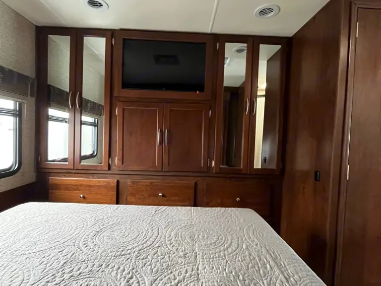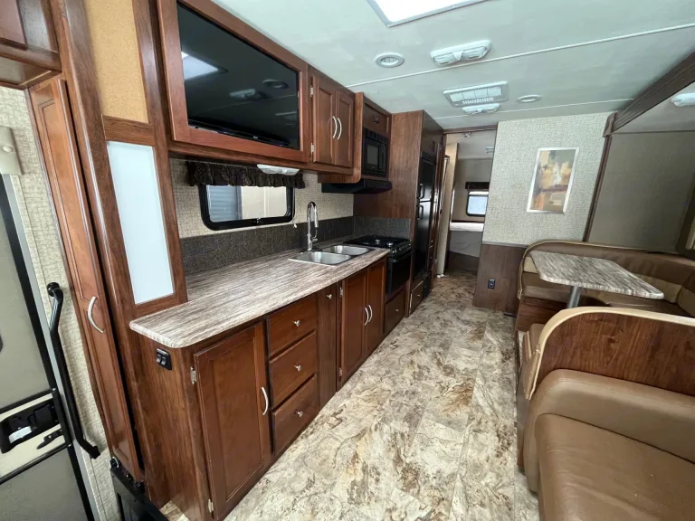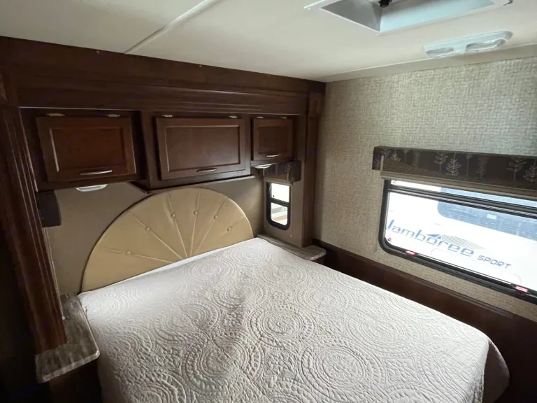 Ce véhicule récréatif sera combler autant les grandes familles que les couples désirant de l'espace. Pouvant acceuillir jusqu'a 8 personnes, cette maison sur roues comprend une cuisine, une salle de bain complète et une chambre principale fermée. De plus, le divan et la banquette se transforme en lit et un lit escamotable électrique est disponible au-dessus des bancs conducteurs et passager. Le réfrégirateur fonctionne a l'électricité et/ou au gaz et le four est au propane. L'électricité se branche sur le 30 AMP.
