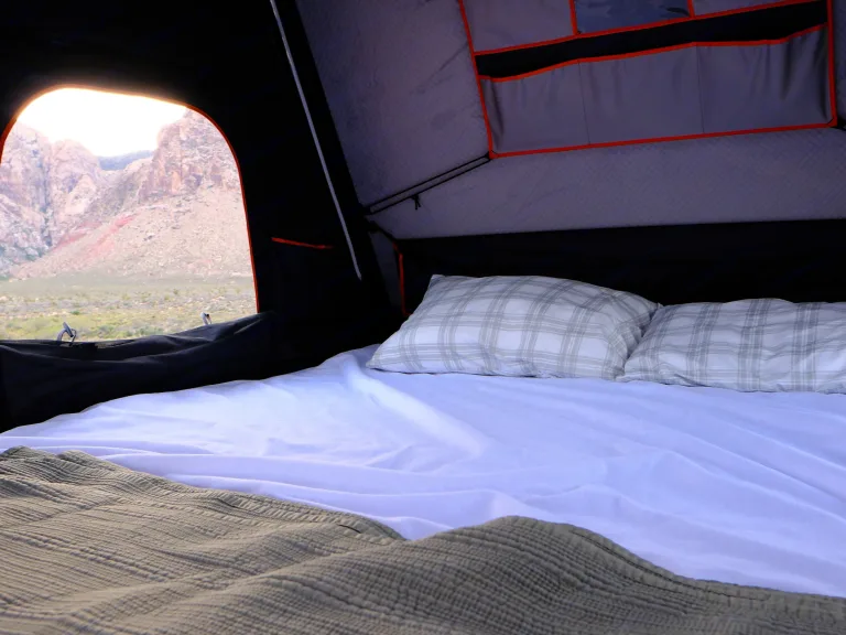 Cozy bed inside an rv rental rooftop tent, featuring plaid pillows, a soft blanket, and scenic desert mountain views from large windows.. Ford Roofnest 2024