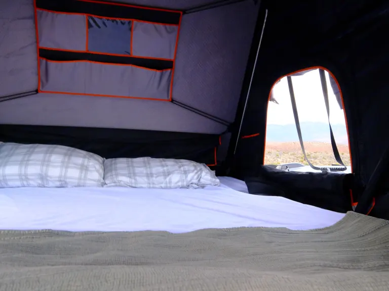Comfy rv rental bed inside a rooftop tent with a stunning desert mountain view, perfect for camping.. Ford Roofnest 2024