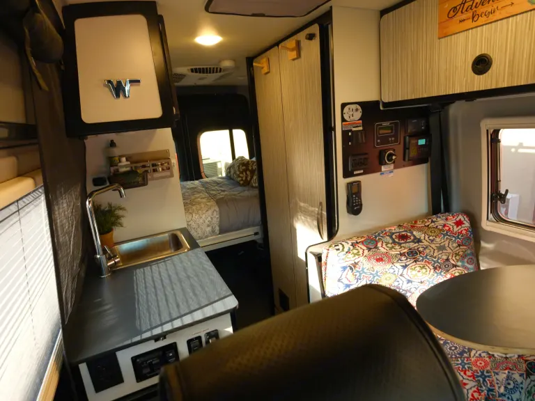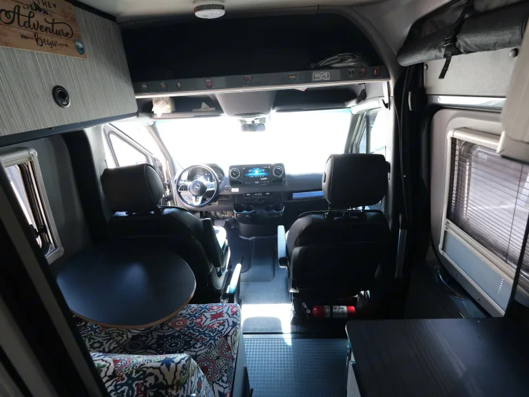 Up front, the driver’s cabin includes modern safety features like blind spot assist, adaptive cruise control, lane-keeping assist, and a backup camera for easy maneuvering. The dual-swivel seats and fold-down dinette create a cozy lounge or workspace for two.Comfort