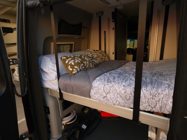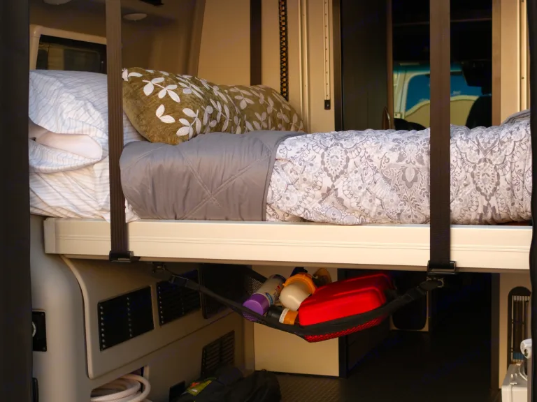 RV rental interior: elevated bed with bedding, under-bed storage with a hose and mesh net, ideal for camper van trips.. Mercedes Winnebago 2024