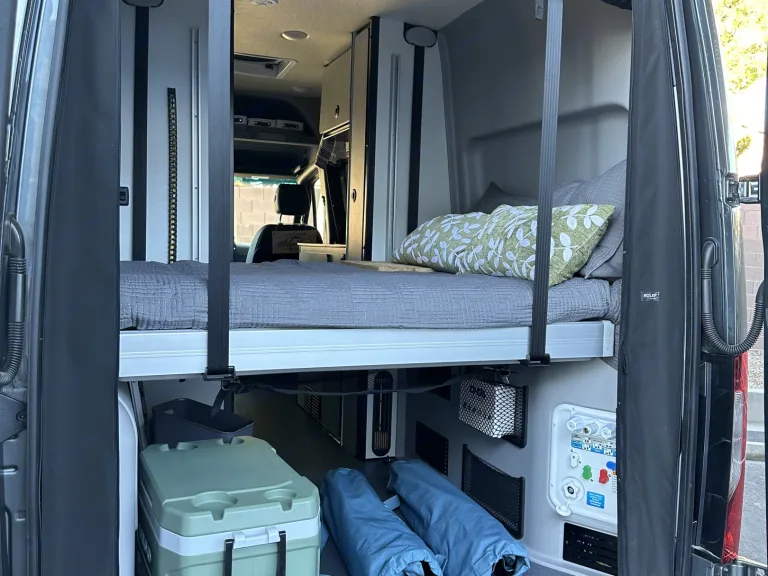 Inside a comfortable RV rental, featuring a made-up bed and storage, seen through the open rear doors.. Mercedes Winnebago 2024
