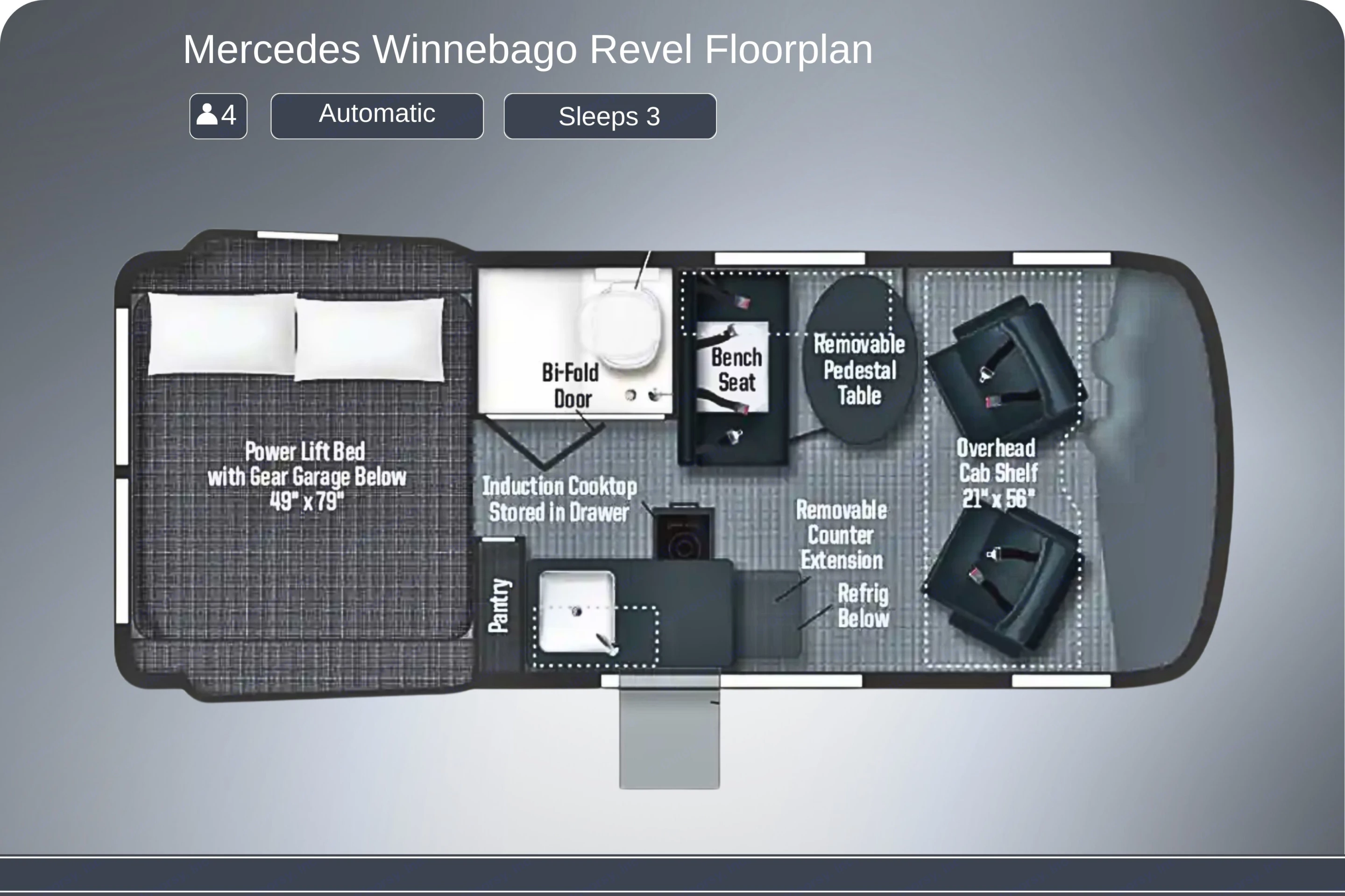 As expected from Winnebago and Mercedes-Benz, the Revel is built with attention to detail, durability, and performance. The interior features a power lift bed with memory foam mattress and a large garage area —perfect for outdoor gear.