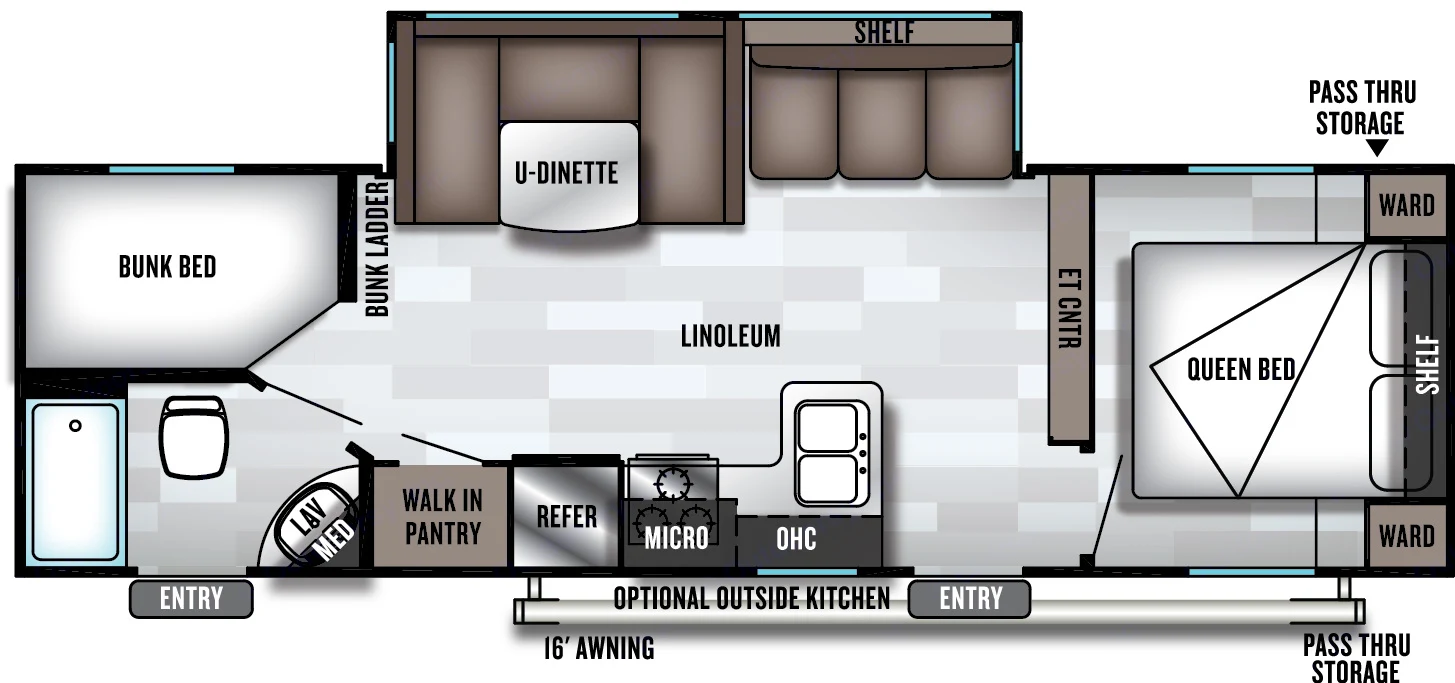 Amazing Spacious trailer with kitchen, bunk, queen bed, full bathroom, 2 door entrance, couch and dinning.