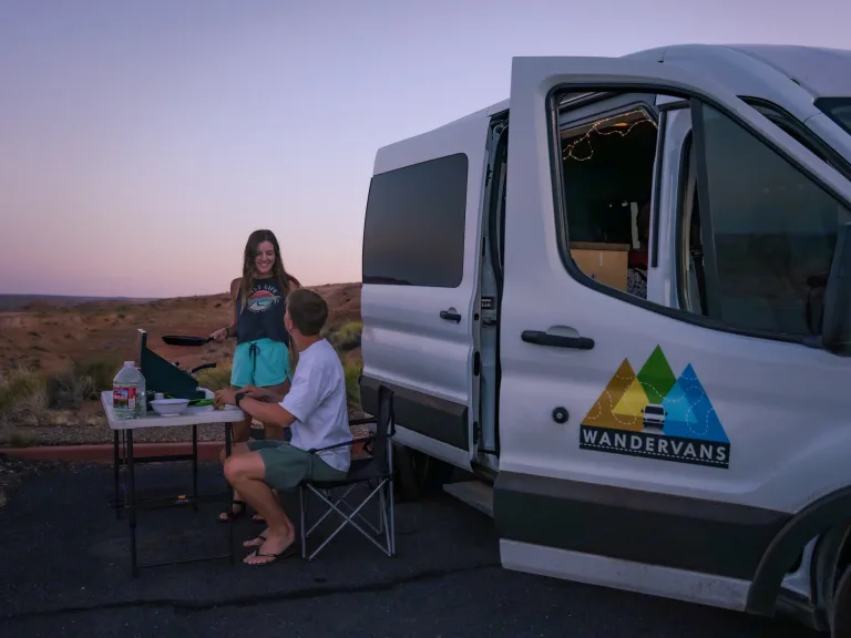 Experience the perfect fusion of outdoor adventuring and luxurious living with our Wandervan campervan—the next evolution of camping. Our seamless self-serve pickup and smart-lock system will have you hitting the road in no time.Embrace the coziness of our medium-sized campervan crafted just for two. Rest well in our ultra-comfortable queen-sized bed, outfitted with a superior 6" memory foam mattress and pre-prepared with a fresh fitted sheet as a part of our commitment to your convenience. We can add a Luno mattress system to create another sleeping area in the front cab area. This is an inflatable mattress system, so families with 1 or 2 kids can easily make this size of van work. We can also add a second row of seating for kids.Designed to deliver an accessible and free interior environment, the 6'5" headspace offers generous room to stretch, lounge, or twirl around. No need to travel light here - our abundant storage area beneath the bed comfortably houses up to 13 large, rolling cases. Your gear will be easily accessible and perfectly organized.Designed with safety and comfort in mind, the leathery seating provides secure belt-fastening for two travelers. To accommodate your party, add an extra 2-person bench with seatbelts upon request. Cook up your camping cuisines in our fully-equipped kitchen boasting a 31-quart refrigerator, a manual pump sink for water access, spacious countertops, a dedicated kitchen cabinet, a deployable kitchen table, and a robust 2-burner Coleman stove (note: 16 oz propane fuel canister not included).Settle back into our camping chairs—provided for each vanner—to soak up panoramas, star gaze or just enjoy a good old-fashioned chat. Sit comfortably inside the van on the plush bench, an ideal perch to prepare for your day’s expeditions.At Wandervans, we celebrate the thrill of open-air living without compromising on your comfort. Our campervan features intuitive magnetic mosquito nets for an easy-in, easy-out experience, ensuring you can bask in the ambiance while keeping the bugs at bay.With ample hooks and extensive storage space, you'll enjoy the convenience of having your personal items tucked neatly away yet always within arm's reach. While designed for backcountry adventures, this vehicle includes a hitch receiver but excludes trailer lights connections to keep the focus on self-sufficient camping.Travel in style and efficiency; this campervan promises an impressive 20 mpg on the highways, making your trips more cost-effective and eco-friendly. Each trip is available with an inclusive 125 miles per day. Need a little more? We also offer custom mileage packages that allow you to pre-pay for your mileage overage for 30 cents/mile as opposed to the standard 35 cents/mile perfect for longer journeys or in-depth explorations.Set off with peace of mind! For more information on our comprehensive insurance coverage, visit our website at .Promising exceptional service and an unforgettable campervan experience, we are excited to help you fulfill your adventure bucket list in comfort and style. Let the open