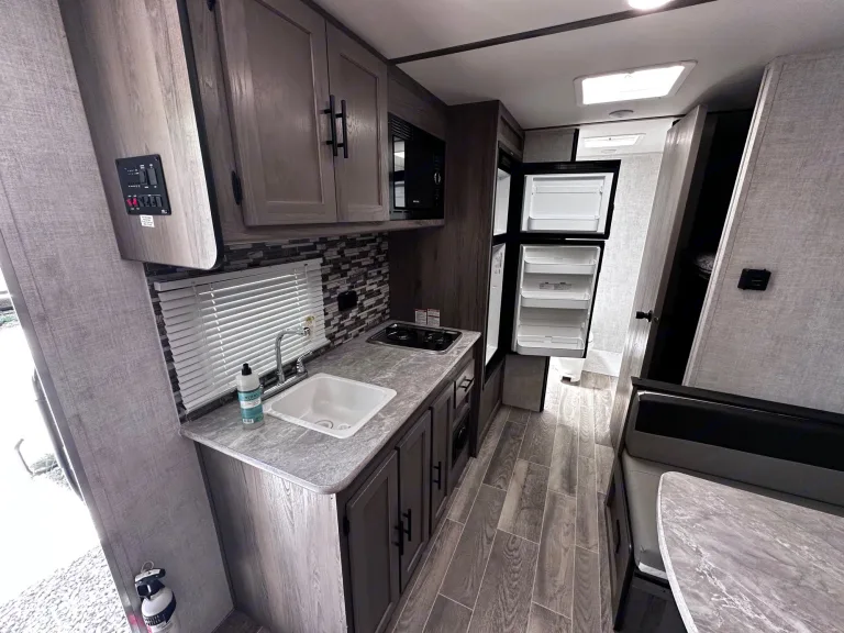 Find a new way to adventure with this travel trailer! The many storage options, like the shirt closet, the double-door refrigerator, the overhead cabinets, and the pass-through storage, will allow you to keep all of your items stored neatly away throughout the trip. This trailer will also let you sleep five people because of the queen-size bed, booth dinette, and set of bunk beds.These trailer have many comfortable benefits, and they are lightweight so that you can vacation with ease. You'll find a 6-gallon gas DSI water heater to keep your shower water hot, and the friction-hinge entry door will offer resistance so that it doesn't fly away while getting inside. The multiple USB ports allow you to power your phones so that you have enough battery life to capture precious memories on your camera, and the power awning gives you an extra outdoor living space.2-Burner Gas Cooktop