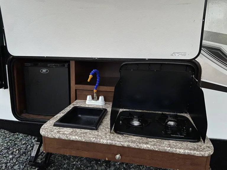 Both gray and black water hold 38gal——— Additional pick up drop off information——*Half ton pickup is required for towing this trailer, in addition you need a trailer brake and 7-pin plug-in on your tow vehicle. We provide a weight-distribution hitch and stabilizing bar.*Some experience towing is requiredPlease have drivers licenses of all qualified drivers (we will take pics at pick up)We clean and sanitize the camper between each rentalAll linens are removed and washed every rental, unless personal linens are used.Cleaning supplies are in the camper including disposable gloves, disinfectant, dish soap, hand soap, and cleaning towels.After you return the camper we’ll conduct a walkthrough and then release the security deposit (less any damages if necessary)Please no smoking in the trailer.What's includedspacious kitchen includes all the cooking utensils/ pot and pans, Pizza cutter, Can opener, Knife set, toaster etc.Toilet paper, kitchen towels, cleaning supplies, dish soap, hand soap. (Don’t forget to pack bathroom/ shower towels, not included with rental)Keurig(complimentary K-Cups)plenty of storagegames. Coloring. Flash light’sPortable outdoor Propane fire place (propane tank available upon request)Linens are included upon request with extra $75.00 fee.(Beds will have fitted sheet replaced after each use for your convenience)Bathroom towels are not included.Any questions don’t hesitate to ask ownerRecommendationsKanaskat-Palmer state park