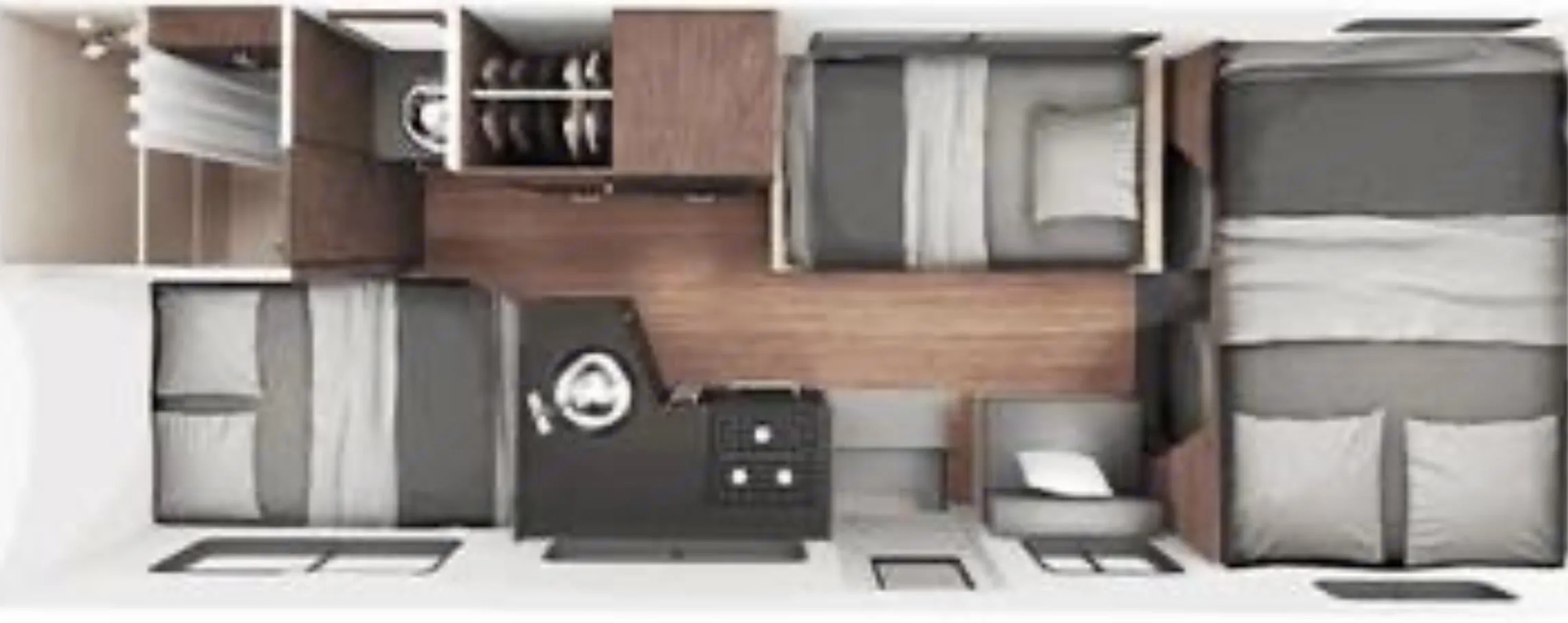 • Blackout curtains, roof vent covers, and cab window shades for daytime sleep or extra privacy