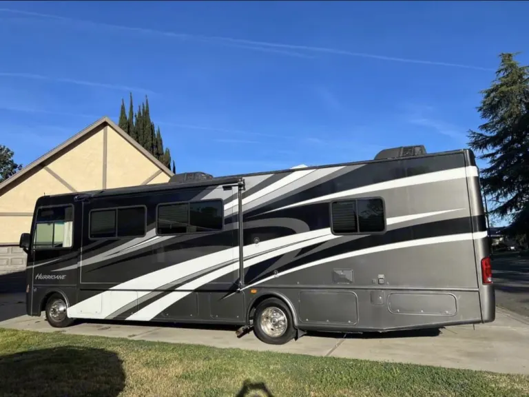 Rarely used 32Ft beautifully functioning Double Slide Hurricane Class A Coach w/Rear Queen Bed w/Shirt Closets, Angle Shower, Wardrobe, Double Kitchen Sink, Refrigerator, 3 Burner Range w/Microwave Above & Hide-A-Bed Sofa Slideout, Booth Dinette Slideout, Cab Area, Exterior Mega Storage, and More. Ford Specifications Provided.