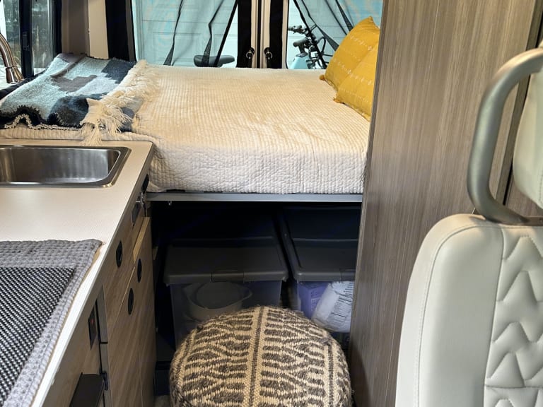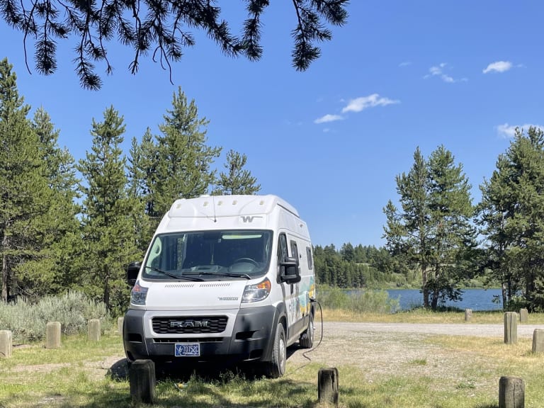 Named after the artist whose work adorns the van, Britt is ready to take you on your next Montana adventure. With the ability to seat and sleep four comfortably, there is no need to leave anyone behind. Britt is fully self-contained with a complete wet bath, heater, MaxAir fan, refrigerator, cook top, and sink. There is a solar panel to help charge the battery when you are off grid. Relax in the queen bed in the main coach or go for the amazing views and comfortable queen bed in the pop top. Easy to drive and park and set up is a breeze.What's includedLinens for the main queen bed and a double sleeping bag for the pop top. 2 camp chairs, small camp table, cookware, utensils, large outdoor rug, Moon Shade awning, towels, full tank of gas, full propane tank, full water tank. Swing through the grocery store and you are set.Airport pickup from Yellowstone International Airport available. Delivery and pickup within 50mi radius available.RecommendationsWith Bozeman as your starting point, your adventures will be endless. National Parks your thing? Be in Yellowstone in a little over an hour, Grand Teton in four and Glacier will take you about five. Fishing your thing? Find some of the best fishing anywhere and be parked alongside the Yellowstone, Madison, Gallatin or Jefferson rivers in under an hour. Hiking more to your liking? You simply can't find better hiking with trails to challenge all skill levels with waterfalls and wildlife and simply stunning scenery. Just want to chill and relax? There is no shortage of campgrounds in beautiful places for you to relax and unwind.Other things to noteWell behaved pets are welcome on the adventure, however, they are not welcome to hang out in the van while you're out on the adventure. Please always have them with you.