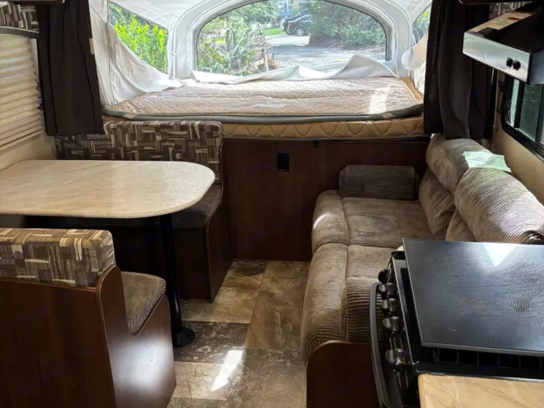 We are a young family that is newer to RV camping. We're loving the experiences and memories we're making and wanting to share that experience with others!This is a perfect family friendly RV Camper Trailer. Dry weight of 2,785lbs and Gross weight of 3,500.It can sleep 4 adults comfortably. With kids up to 6-8 people. It has two pop-out queen beds (with heated mattress pads upon request), love couch that converts to smaller bed, and a dinette that also converts to a smaller bed.Conveniently has a toilet, indoor and outdoor shower, full kitchen (microwave, stove, fridge, freezer, sink), along with a working fan, air-conditioning, and heater. It also is equipped with CD player, radio, bluetooth, DVD player, and tv. We have supplied a case full of movies, some lawn games, board games, cards, and coloring books with crayons for the family to enjoy.Easily towed due to its small weight class, but has everything you'd want or need in this tiny package. What's included• Blankets/Pillows