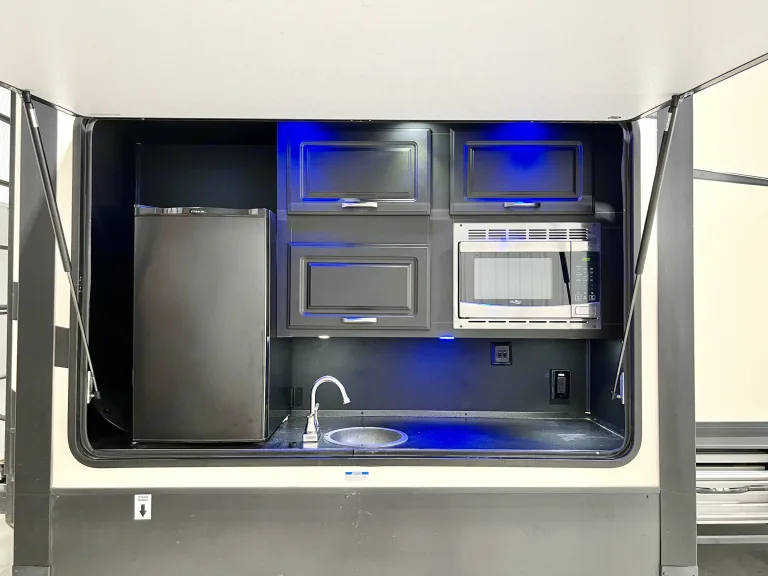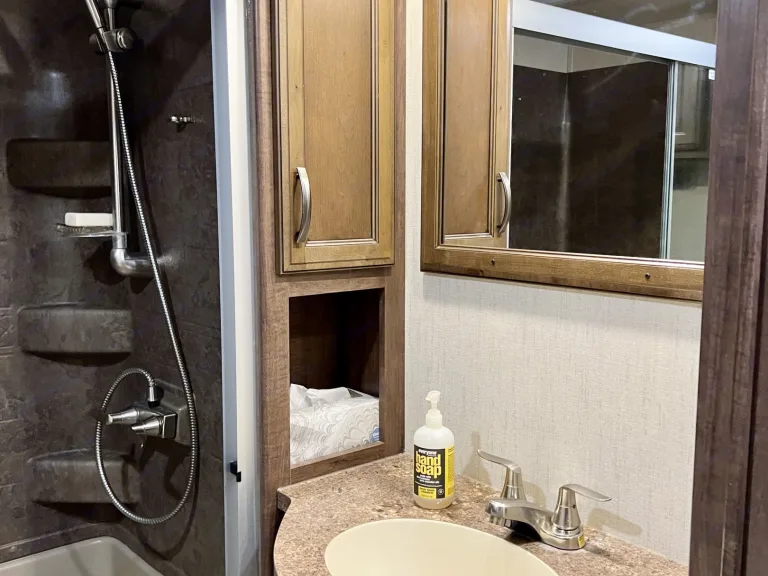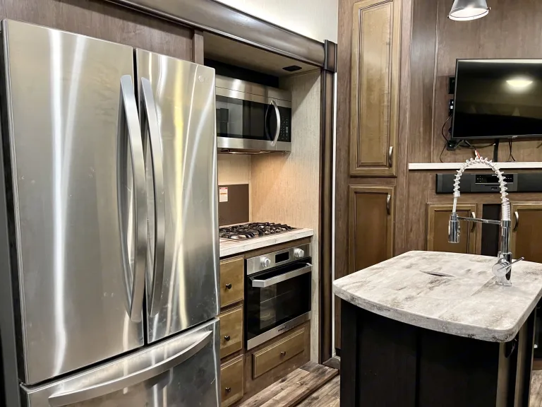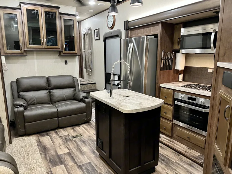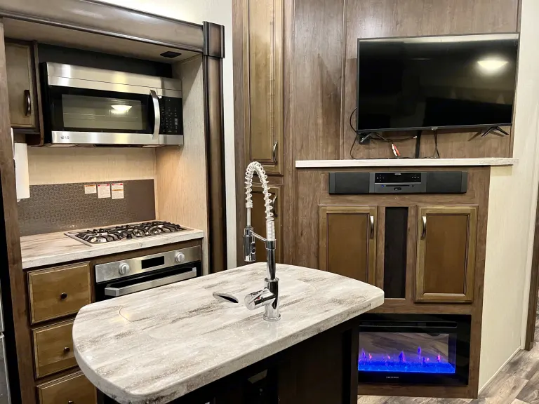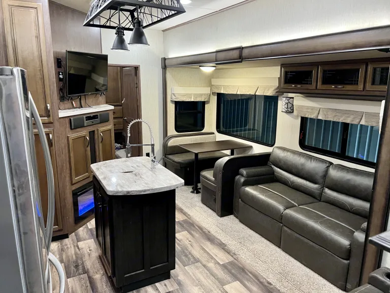 Please note that this unit is rented for delivery only.Our spacious fifth wheel is fully stocked and ready for your family's next adventure! Featuring a queen master bed and bunk room, our camper is family friendly and can comfortably sleep up to seven people (only children on the bunk beds). We supply sheets, towels, crib, high chair, soap, utensils, etc. so all you have to do is show up!Rain have you stuck inside? The RV is equipped with Smart TV's (where Wifi is available), DVD's, games, and even a few toys. When it's time for a meal, our kitchen is stocked with a toaster, coffee pot, basic pots and pans, and utensils. You can even fire up the grill outside for some steaks and enjoy dinner near the outdoor kitchen!Sleeping arrangements: