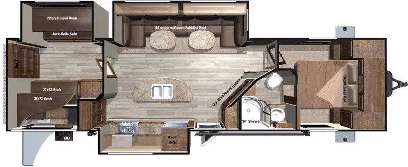Your next Adventure Awaits in comfort and style with our welcoming and warm Open Range 308 Luxury Bunkhouse Series trailer. This 3 slide out 35’ over-all length, 50/30AMP trailer has everything your family, friends and fur babies would want and need for your summer getaway to enjoy every moment!This trailer comfortably hosts 8, with 2 Queen size beds (one in private bedroom + one coil-over-spring air sofa in living room), 2 twin bunks and 2 single bunks, with 2 separated sleeping rooms including one expansive slide out 4-bunk room perfect for the kiddos. Two families could comfortably occupy this 30’ interior luxury trailer for any excursion. A giant slide out for the U-lounge wrap-around sofa which comfortably seats all 8 for a homemade meal stretches through the living room space, across from the slide out kitchen and island. Two hide-away tables can be set up and used, and also easily tucked out of sight in a breeze. 2 Smart TVs easily tether to your cellular wifi or campsite wifi for connectivity to all the streaming apps (Adventure Awaits profiles included in many popular streaming apps on these TVs for you), including the bunk room TV keeping the kids entertained at night! All beds come fully set up with linens, comforters, pillows and bunks have sleeping bags; plus there is extra blankets for anyone feeling chilly!The indoor kitchen boasts all you need for breakfast, lunch and dinner including a complimentary coffee bar, full assortment of every kitchen essential and a double stainless sink in the island. If cooking outside is your preference, the outdoor kitchen is outfitted with a fridge, sink, microwave and gas stove. Additionally, there’s a hot/cold outdoor Shower at the rear Hookup Compartment if anything (or anyone hahaha) needs a rinse before going inside!Power awning with LED lights, full indoor/outdoor stereo, BBQ, propane fire pit and all the chairs and 12’ RV mat to make your stay comfortable and cozy await you with this unit and are all inclusive. If you want a cozy night in, we’re fully stocked with board games for the family and friends, and adult card games for later!This trailer sets up easily, even for a first time camper. The instruction booklet is thorough and straight forward and we are just a simple call or text away day or night to help with anything that comes up!We can’t wait to for you to begin making new and amazing memories this summer! Adventure Awaits! What's included• All bedding, Linens, pillows, sleeping bags, towels, extra blankets