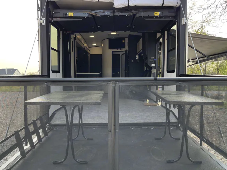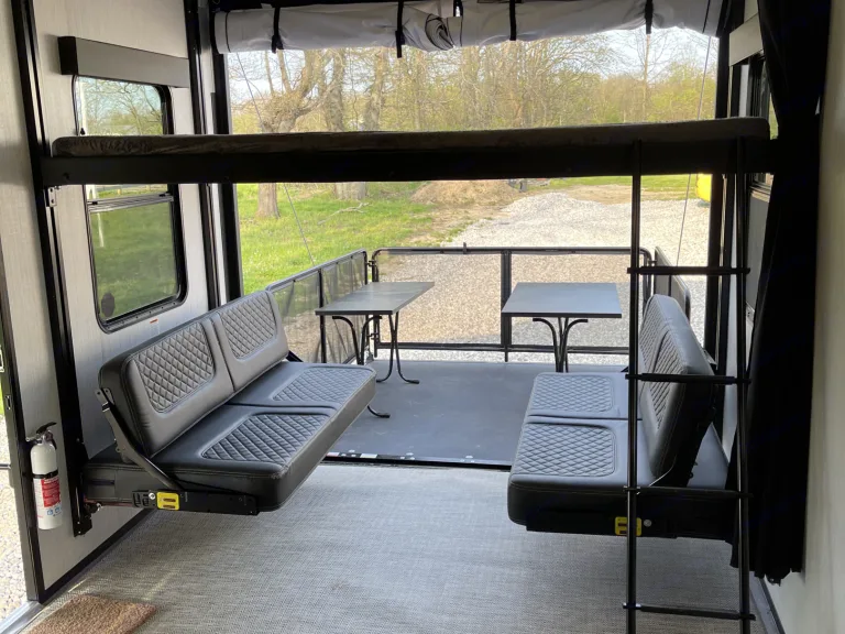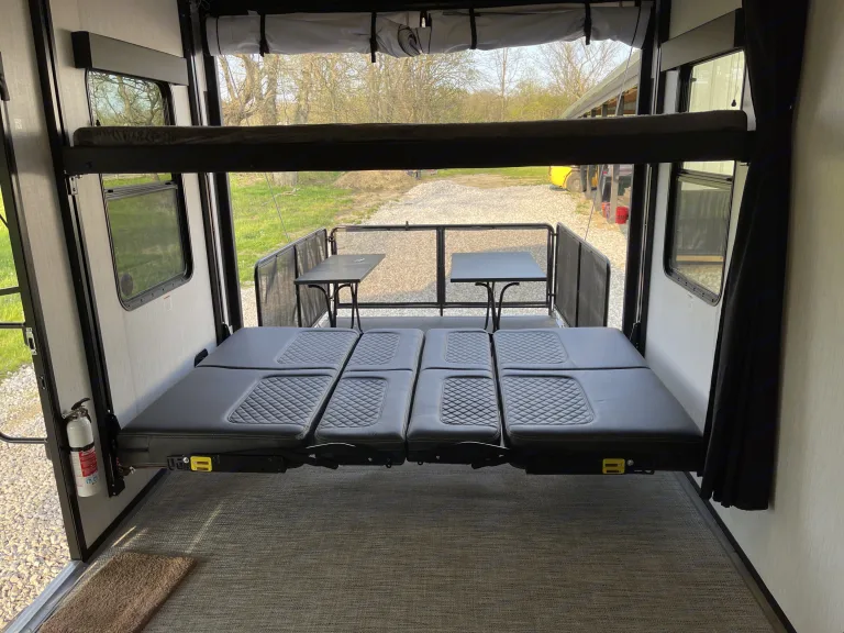 3-fold out sofa sleepers and an oversized queen loft bed that could sleep 3-4 kids under 12YO with no issue at all.Large 19' power awning folds out over the entire passenger side of the unitThe rear garage is 16' which can handle most 2- or 4-seater UTV or 2 ATV's. The ramp doubles as a party patio with built in railing to keep the little ones safe!