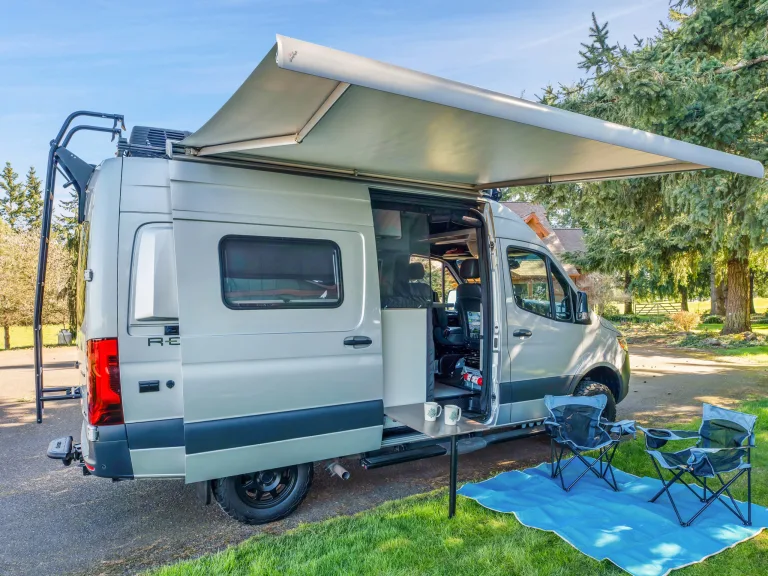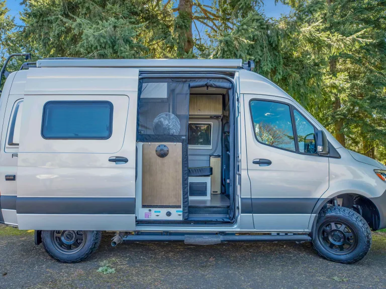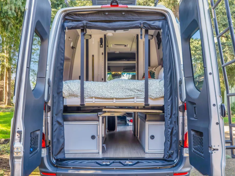 Maverick is light on miles and built for fun! . This rig has many upgrades for your comfort and sense of adventure. Maverick features a power lift full size bed, induction stove, sink, full toilet / bath efficient heater, A/C, retractable awning and insect netting and black out curtains for all windows to enhance privacy and security when needed.We love the outdoor shower attachment and retractable awning, set up is quick.We have added the following upgrades:*Additional bench and table seating in the rear, great for remote working, games, or a nice meal