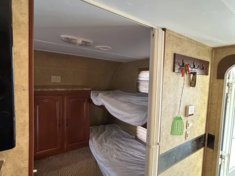 Meet Sandy this very cute Keystone outback camper. It has four twin beds in the front couch dinette and then a private master bedroom.