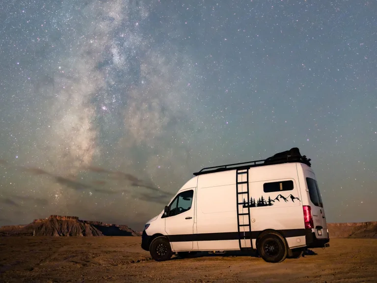 Adventure ready Mercedes Sprinter campervan. Driver and passenger seats swivel. Bug screens keep mosquitos out. Kitchenette with spacious fridge, microwave, built in propane stove, sink. Outdoor shower with hot water. Propane furnace to keep you warm at night. Custom mattress with bedding included. Solar panels and inverter let you get off the grid and keep your devices charged. Roof rack allows for plenty more storage and a great hang out spot for sunsets and stargazing. Curtains and shades allow for full privacy. What's included• Bedding