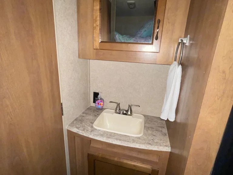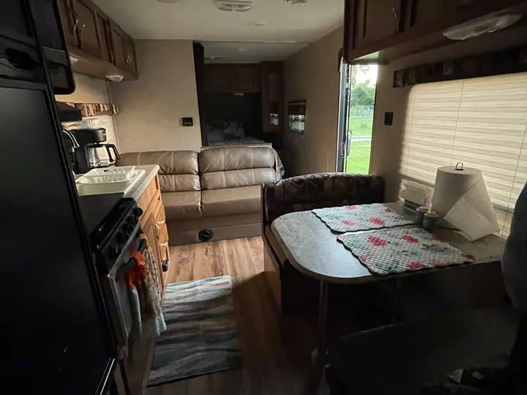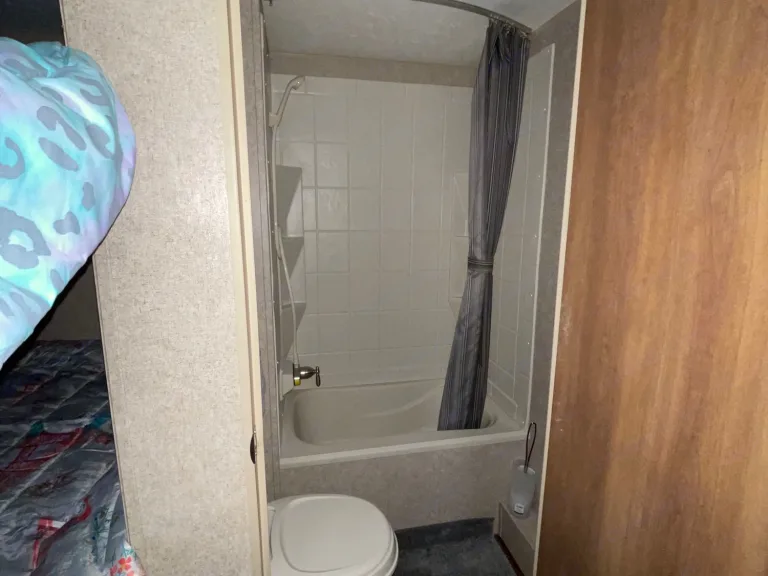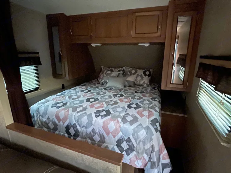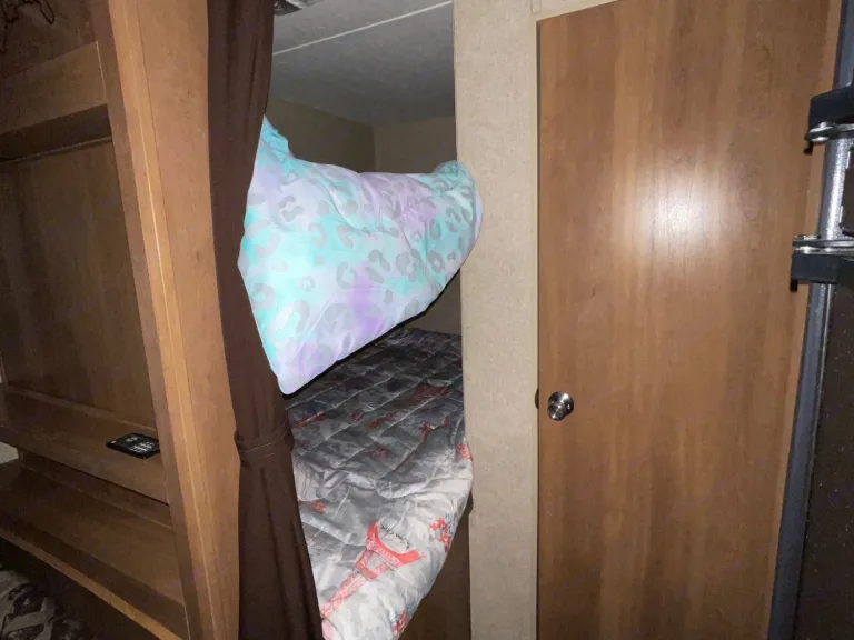 This camper has a 6” memory foam mattress in queen size, 1- bunk is 3/4 size and the other is twin size. Dishes, minimal pots and pans, coffee pot, silverware, paper towels, toilet tissue and towels