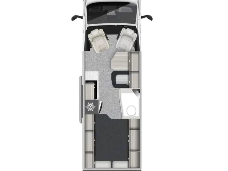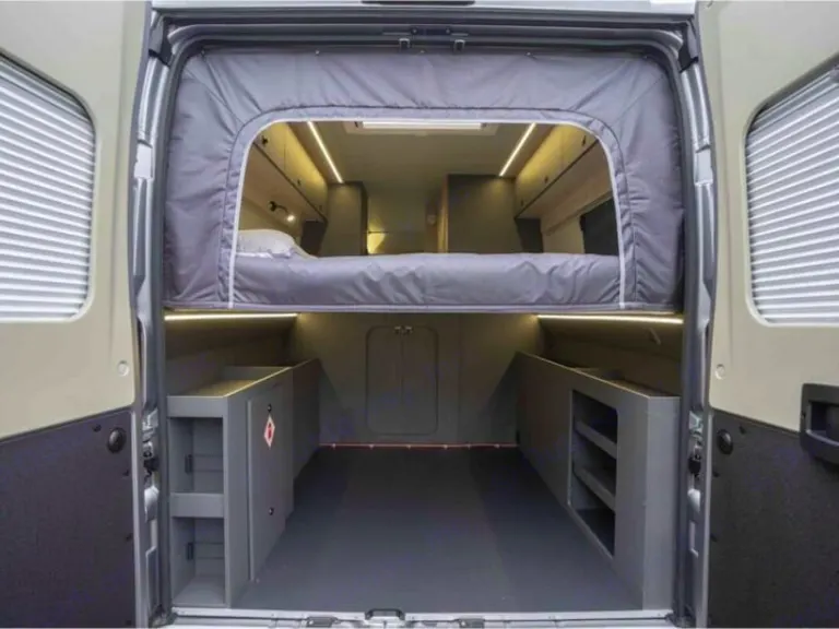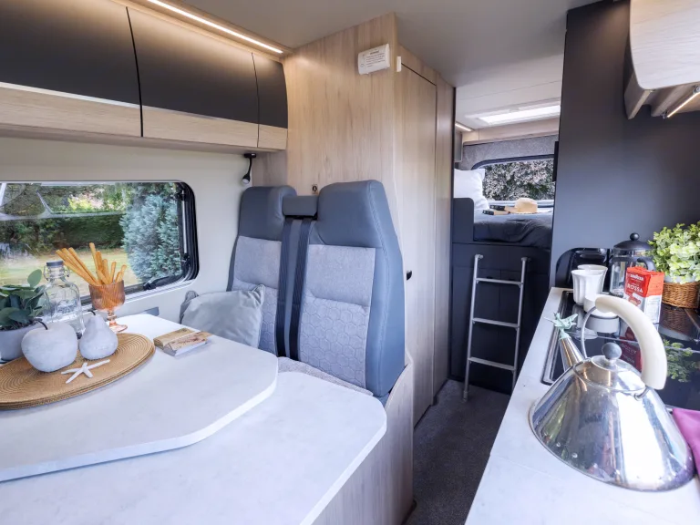 This award winning model is perfect those who want the freedom to roam but the security of having their bikes and equipment stored internally. There is a full kitchen, including 2 burner gas hob, gas oven, sink and fridge with freezer compartment.