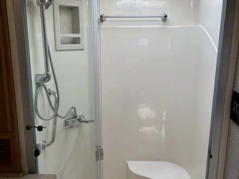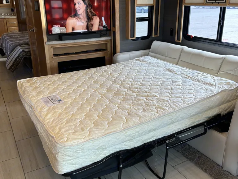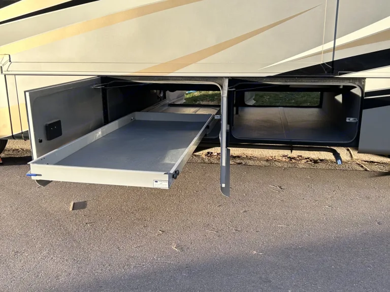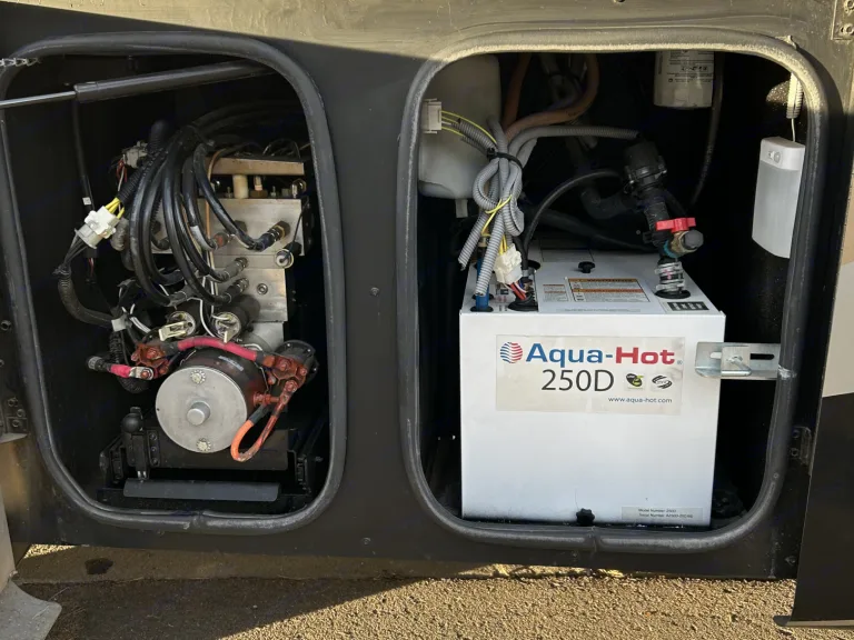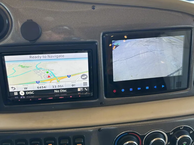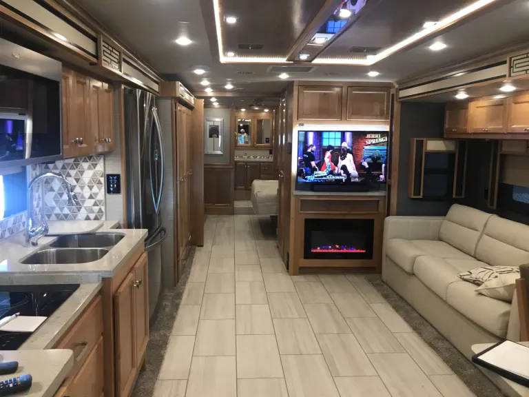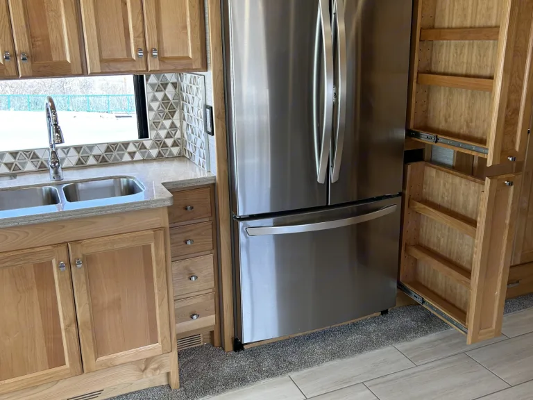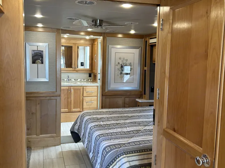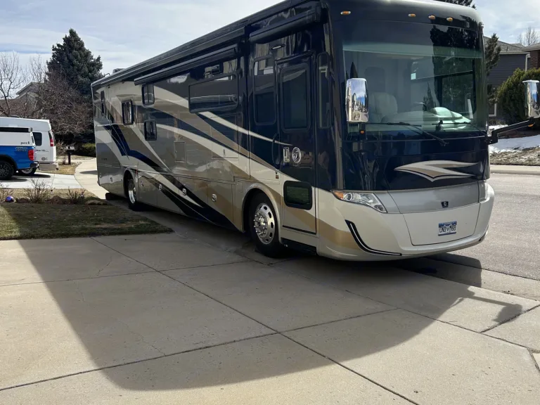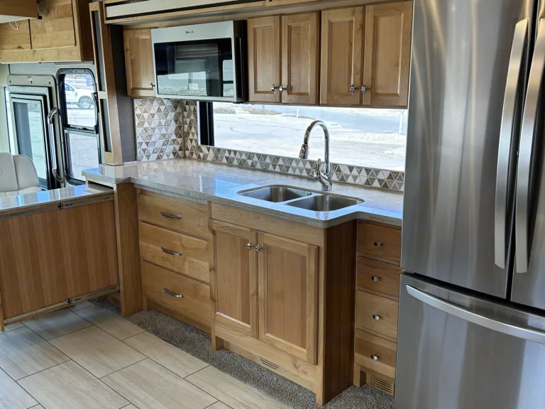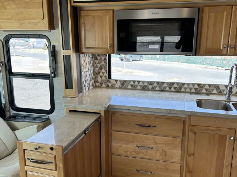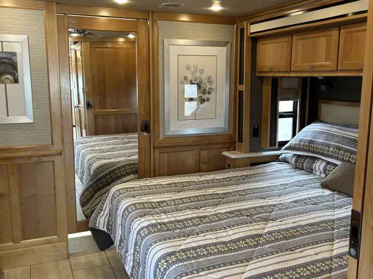 The Tiffin Motorhomes Allegro RED Class A diesel motorhome is insanely comfortable and highly luxurious! This powerful coach is propelled by a Freightliner rear engine diesel chassis, Cummins ISB 6.7L engine, and an Allison 3000 MH 6-speed automatic transmission. The interior is extremely upscale and residential with its ceramic tile flooring, central vacuum, sound bar sound system, high-gloss handcrafted cabinets, Ultraleather furniture, panoramic galley window and bedroom ceiling fan. Tiffin’s mantra “Roughing it Smoothly” is apropos and makes me smile every time I see it on the door.
