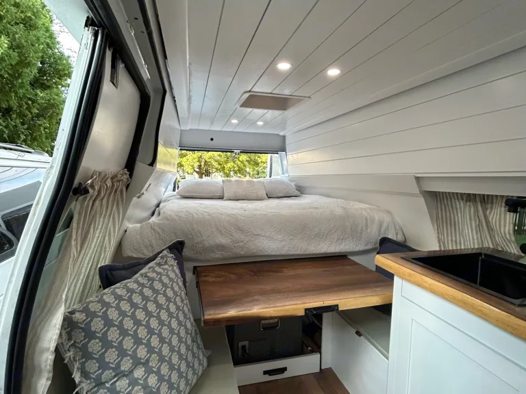 Beautifully crafted camper van built for maximum utility and comfort. Ready to take you wherever your adventure may be. With a high ceiling (5 Foot 8 Inches) and Queen size bed situated longways (Unlike Most Vans) you won't be squished in and will get a great night sleep! Van features a full power system with solar, a rooftop vent, sink with 30 gallons of water, propane stovetop, refrigerator/freezer, composting toilet and plenty of storage.What's included• • Full electrical system (standard plugs and USB outlets)
