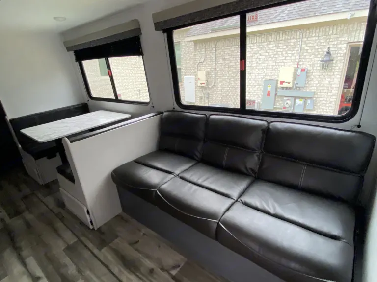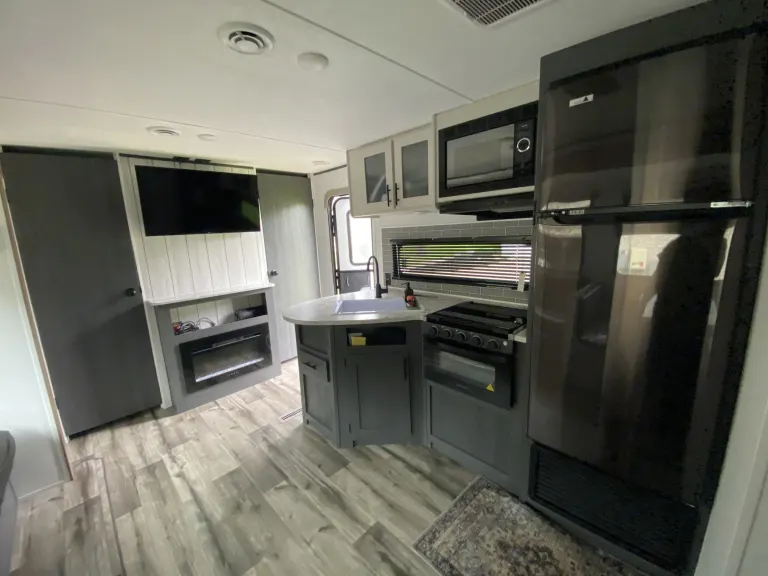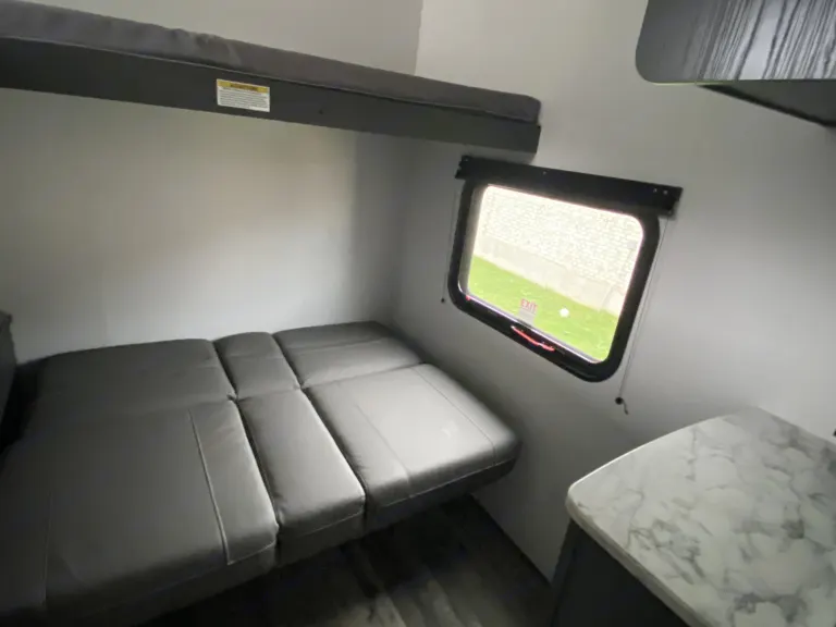 When you enjoy hosting family and friends, this bunkhouse trailer makes sense! You will be able to offer them a private bunkhouse with triple bunks and seating that doubles as sleeping space and/or the living room furniture to sleep on. Your oasis will be in the front which includes your own residential queen bed and plenty of storage for your clothes and things. The central living area offers seating, dining and cooking amenities, plus a full bathroom which is super convenient.What's included• Trailer is compatible with 30 or 50amp hookupsOther things to noteNo Smoking inside the trailer.