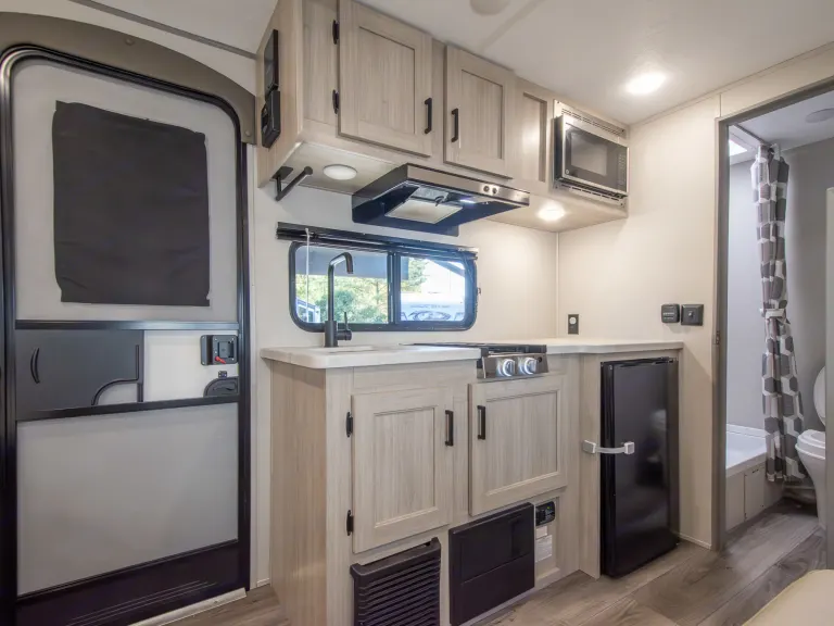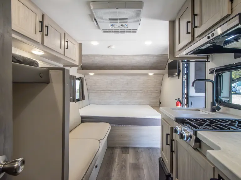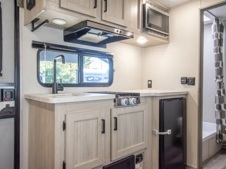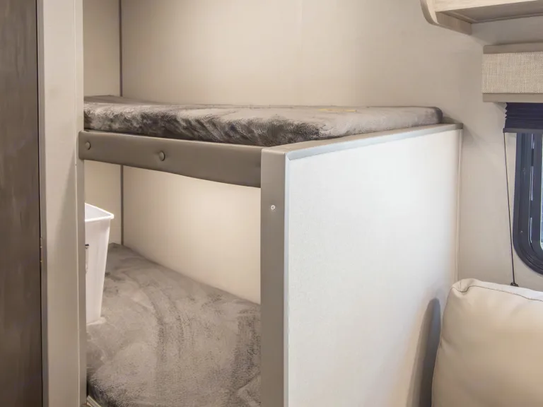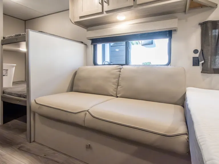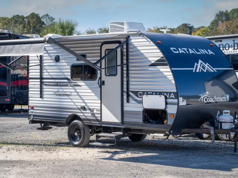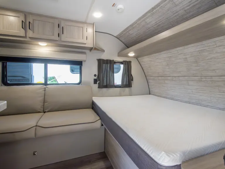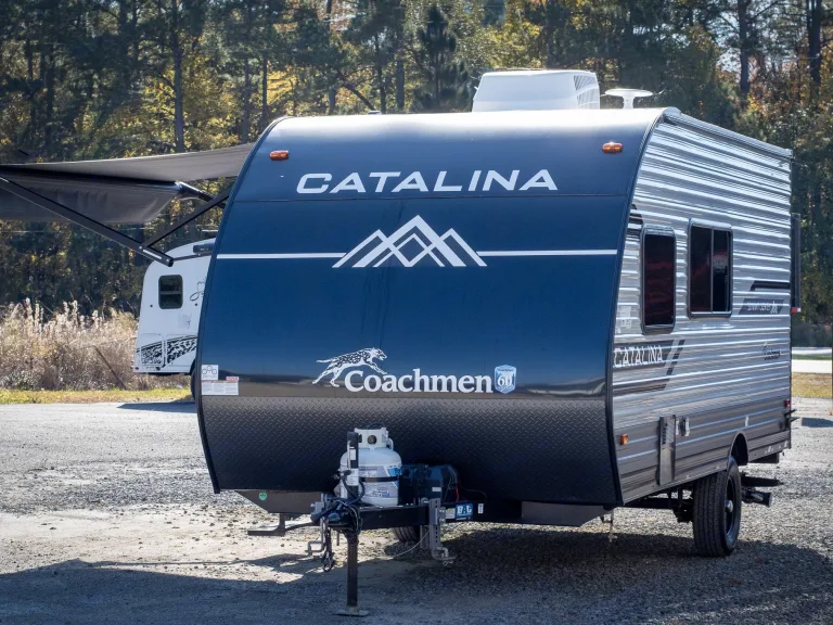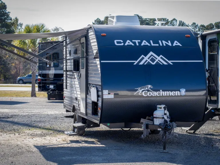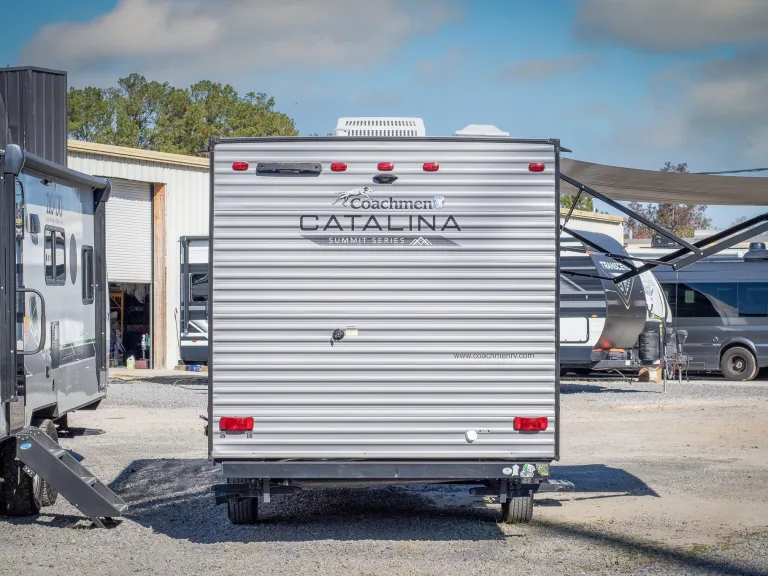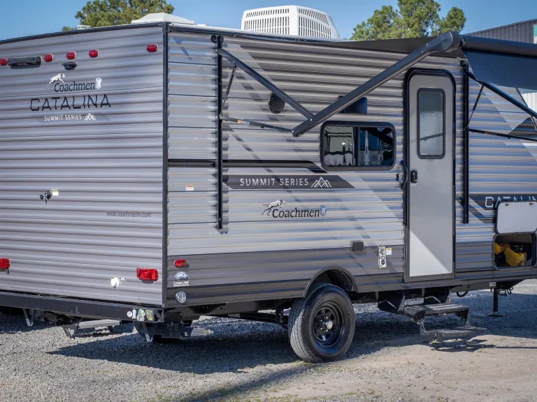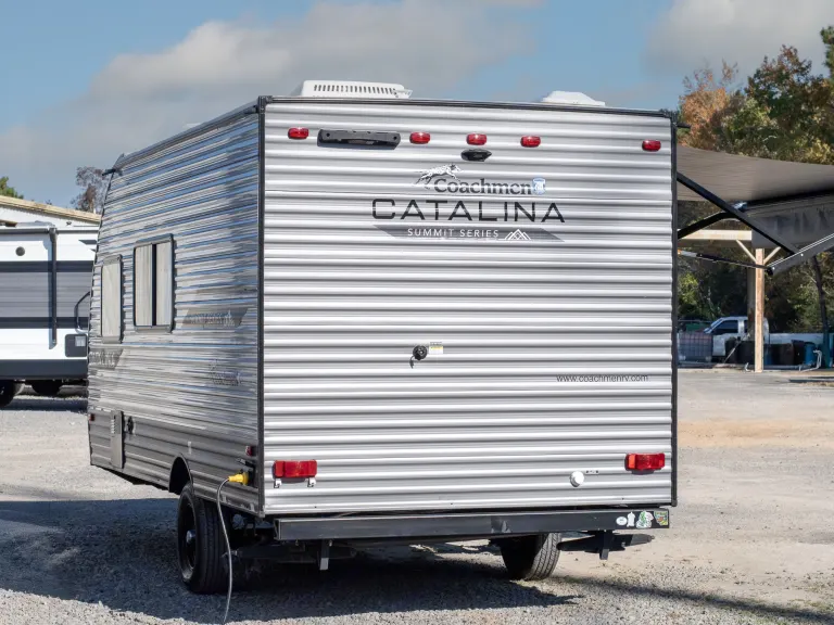 60" SofaThis travel trailers is perfect for a young family or smaller group. You can easily sleep four or more with the rear set of bunk beds and queen bed up front. There is also a 60" sofa for inside down-time, as well as complete kitchen and bath amenities so you can cook and stay clean while traveling. The rear corner bath features a toilet and 36" x 30" shower, and it's conveniently located next to the bunk beds which is great for little ones at night. Cooking inside will be easy with a GE stainless two-burner cooktop and single sink, plus there is also a GE microwave oven for snacks and things that you can easily warm up. If you plan to spend most of your time outdoors, you will find plenty of storage space in the front exterior storage compartment, and there is also plenty of storage inside as well.With any Catalina Summit Series 7' by Coachmen RV, you can create an easier adventure with the versatility and simplicity of the shorter lengths and lighter weights! Each includes a premium exterior graphics package, a smooth HD aluminum radius front, and EZ lube axles with leaf spring suspension. The exterior offers a heavy duty standard tongue jack, a diamond plate rock guard to protect against road debris, exterior RG-6 coax cabling and satellite prep, rear view camera prep, and flush mount baggage doors with radius corners for your outdoor gear. Inside, you will enjoy a premium JBL interior speaker, USB charging ports, seamless Thermofoil countertops throughout, a deep basin farm style sink for easy cleanup, and GE kitchen appliances. It's time to choose an affordable and maneuverable single axle trailer today!