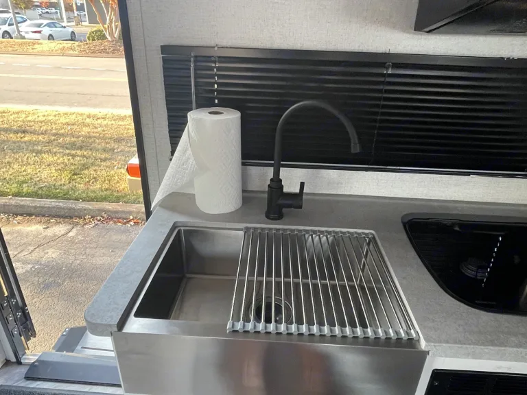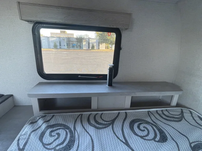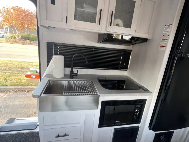 This is a great little camper if you want to get out and about. We have an outdoor griddle you can use as well as a 2 burner stove inside the camper. We provide basic kitchen utensils, pots, pans, 2 zero gravity chairs, and 6ft table. The TV can be mounted on the wall inside. The bed is amazing and you will love the lighting. The other nice thing about this camper is you don't need a huge truck to pull it. Most SUVs and small trucks can pull this camper with no problem. WE DO NOT Provide Linens for the beds - you will need to bring linens. I can empty the black and gray water tanks for an additional fee. I will also deliver for an additional fee, however delivery is only available if I am available when you need it delivered/picked up. Unless you are going to need the Air Conditioner, the camper will run on just the battery or a regular 110 volt plug. If not using a 30 amp plug you will not be able to operate A/C. Let me know if you have any questions.What's included• (2) Zero Gravity Chairs