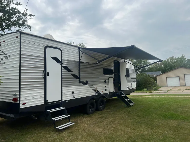 Our 2022 camper is a clean & pet friendly rental to spend some camping time with your family or friends. There is a king size bed in a private room, two bunk beds, table to bed conversion, and sofa that slides into a twin bed. There is a spacious living area including a TV and fireplace. What's included• We provide a mini crock pot, Keurig coffee maker, toaster, cookware, utensils, clean linens, outside rugs, 3 camping chairs, and lights to hang around your site. RecommendationsSchedule a pickup or we can deliver within 100-mile radius (extra charge applies for delivery).Other things to noteThere is a nice size refrigerator and freezer inside along with an extra outdoor mini fridge.