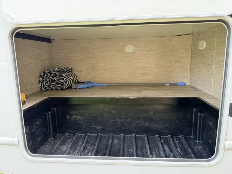 Particularity the main outside storage is large . 4 camping chairs are also included.
