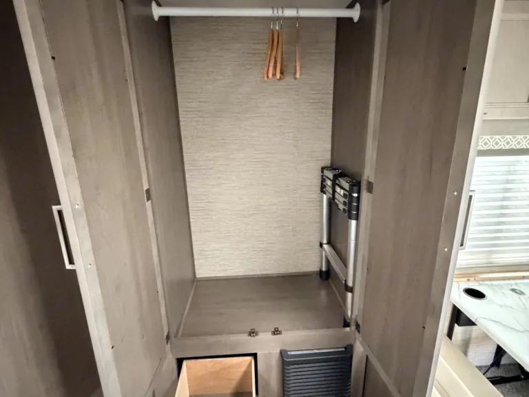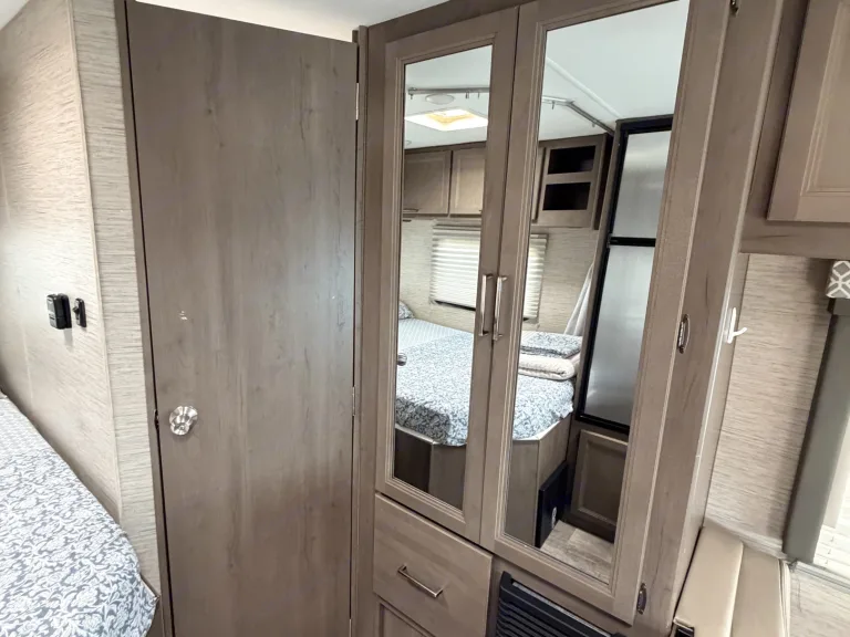 This RV rental showcases a cozy bedroom setup with a patterned bed, mirrored wardrobe, and convenient storage solutions.. Thor Coleman 2023