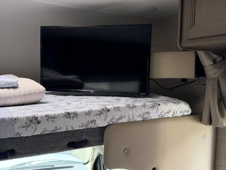 Inside an RV rental, showing the cab-over bunk with a TV, floral bedding, and the vehicle's dashboard below.. Thor Coleman 2023