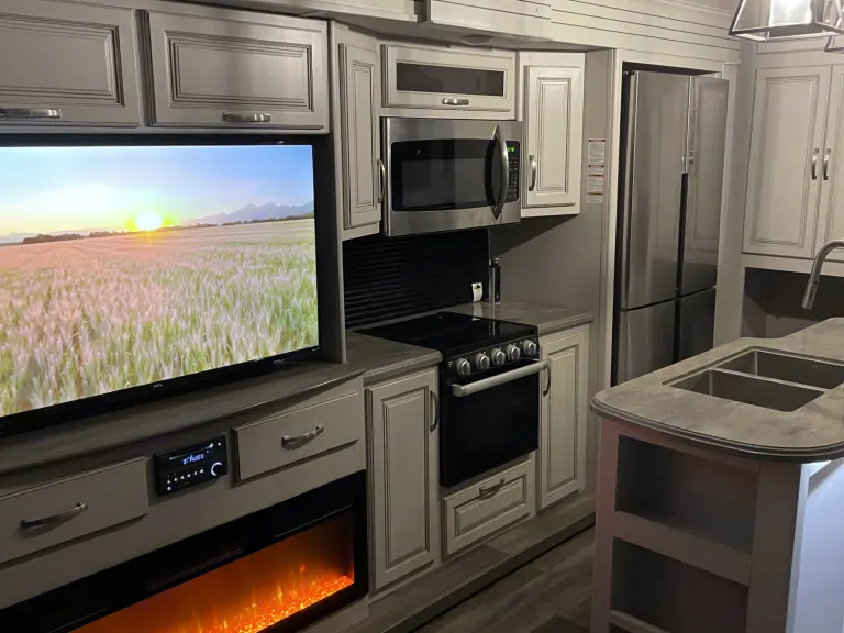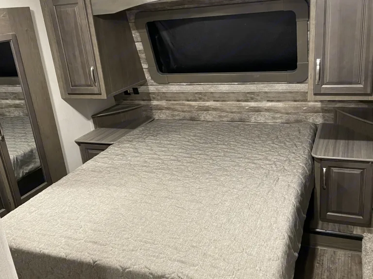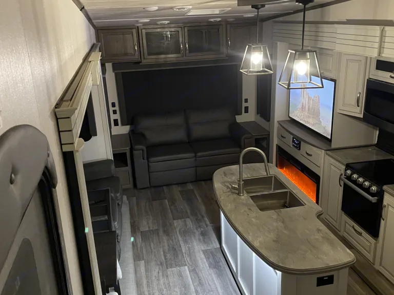 Like new cougar fifth wheel with dinette, large tv, heated and massage recliners, residential sized fridge for extended stays, large shower
