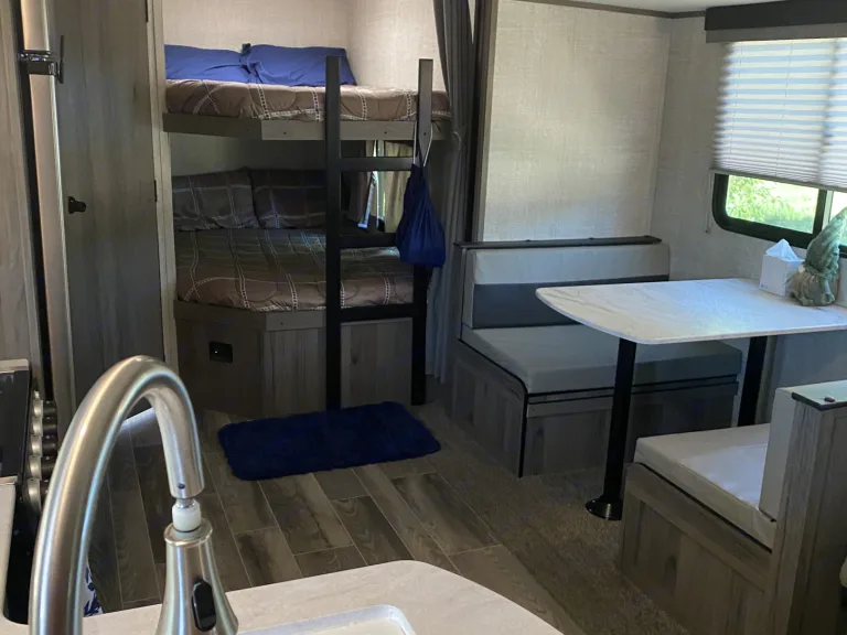 Fresh, bright and new family fun! Private queen sleeping quarters, bunk house with full size beds, fold out couch, and easy to convert dinning area. Full bathroom featuring a shower with a small tub. Everything that you need in this sleek kitchen, plus 11 cubic feet fridge. Ready for your family getaway!What's includedfresh bedding and towels for 8, camper set up essentials RecommendationsGreat for campgrounds around Colorado, stay in the cooled AC unit with heat for the chilly nights while you hike, fish, and see all that the area has to offer . Other things to noteNo smoking and, no parties, remove all bedding when returning camper and please be respectful and take great care of our family camper. Must have a truck with a towing capacity 8500.