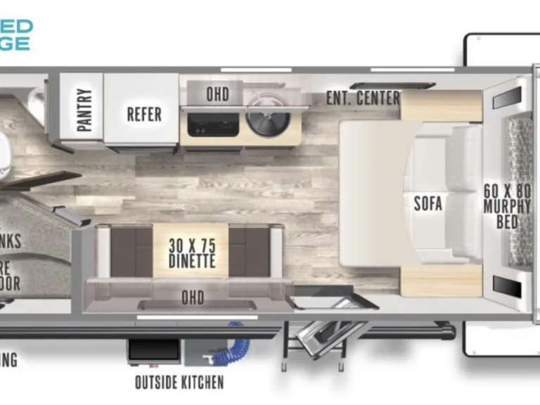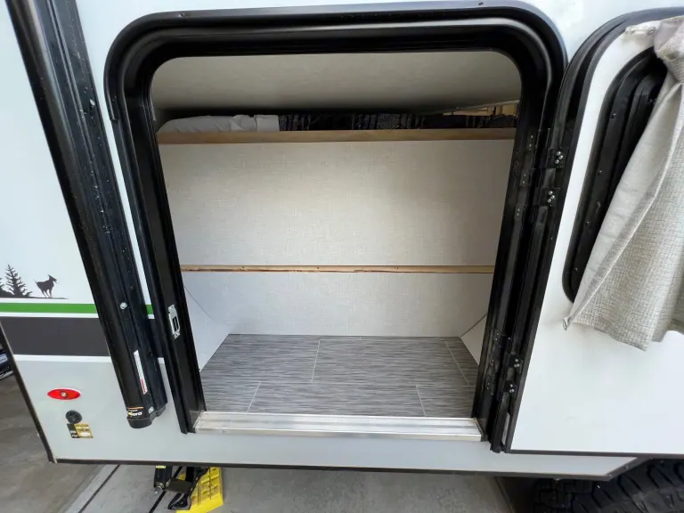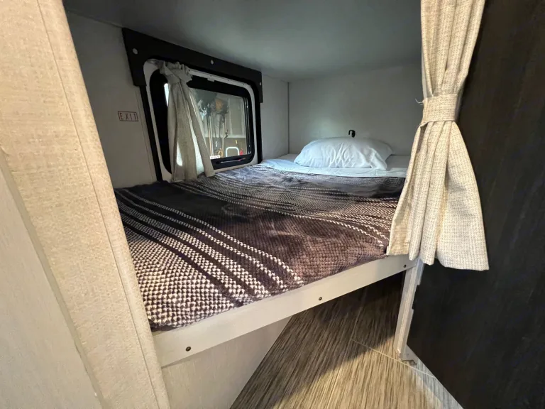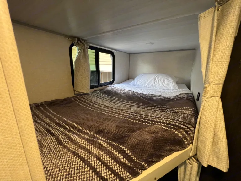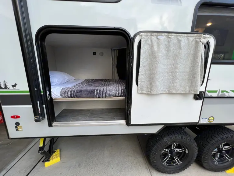 Hanging Closet storage on either side of queen bed, under couch, under dinette, under bottom bunk from inside as well as bottom bunk can be flipped up to allow additional storage that is accessible through a rear hatch.Anti sway weight distribution hitch included with rental.Trailer Weight;