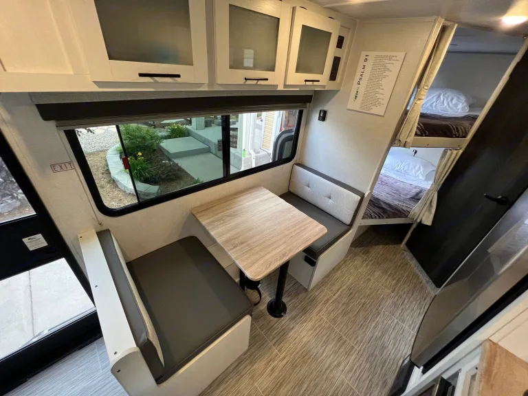 ---30” wide Dinette, converts to bed and will sleep one adult or possible 2 children.Storage;
