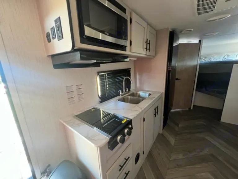 We are located in Columbus, GA. In the front of this trailer is a very relaxing queen-sized bed. The rear of the trailer has a set of bunk beds with full size beds with ample room for both adults and children.This trailer can comfortably sleep 6 with the U-shaped dinette and couch turning into beds. There is a tv with Roku in the living room with hdmi ports.The kitchen has a refrigerator and freezer, as well as a microwave, 2 burner, stove, sink, Keurig and toaster.Generator can be added if needed.