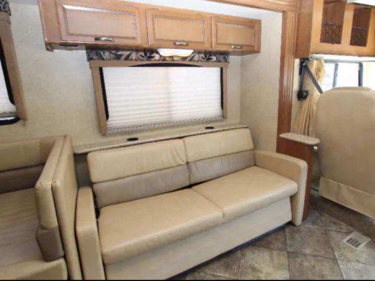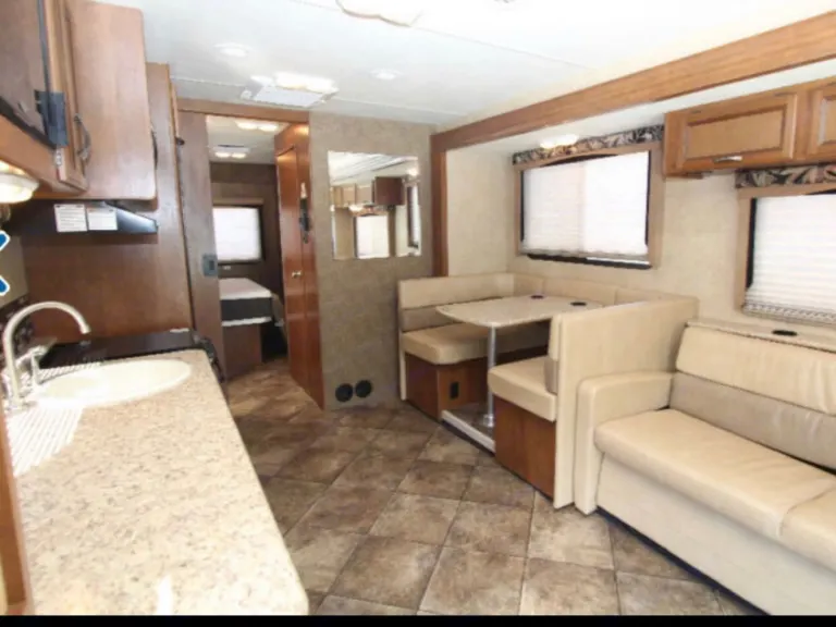 This 31Ft., class A, RV is super easy to drive with its cruise control settings. Sitting above the rest, on a Ford chassis, with a very large windshield for great visibility. 3 cameras for easy parking are displayed on the dash. Automatic electric leveling system that makes setting up a breeze. The interior is fully equipped with a conversion table bed, jack- knife sofa, & an overhead bunk bed. As you enter the rear bedroom you will see an upgraded comfortable rear Queen-sized mattress with nightstands & overhead cabinets for plenty of closets and drawer storage. Between the closets you have a 24” Led flat screen TV. The kitchen offers an all in one cooktop & oven, convection microwave, refrigerator/ freezer, overhead cabinets for dishes, a single sink, with a pull-out pantry and tons of storage inside an out.What's includedCookware, cups, napkins, paper towels, toilet paper, cleaning supplies, plates & utensils.Gas tank will be full at pick up, please return with a full tank or take advantage of the pre-paid refueling add-on.For an additional charge, delivery & pickup within a 20 miles radius is an option as well.A COVID- Clean will be applied to the RV before pick up or delivery.